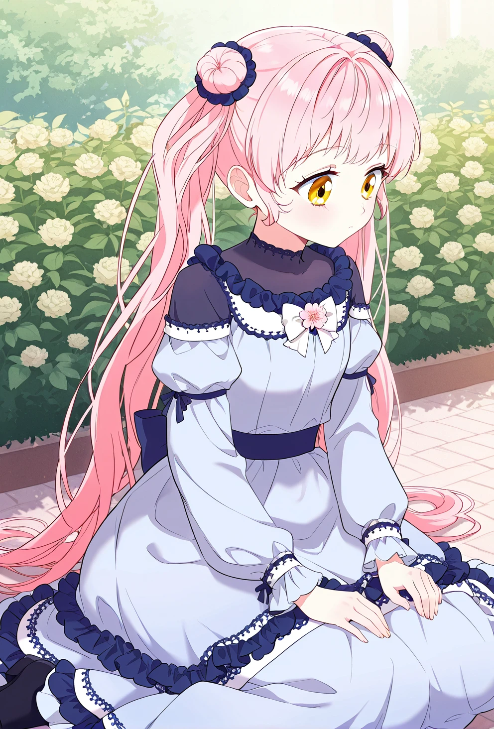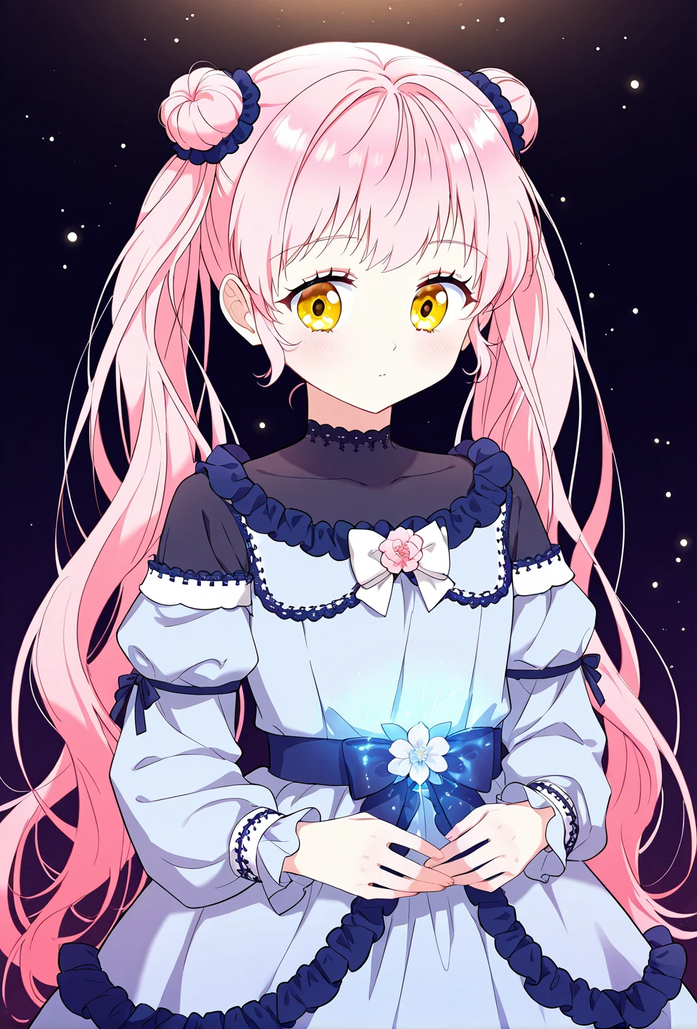 AyrinEtam, 1 girl, solo, small stature, golden eyes, pink hair, very long hair, parted bangs, blunt bangs, side strands, twin buns, twintails, hair buns, hair ribbons, dark blue ribbons,