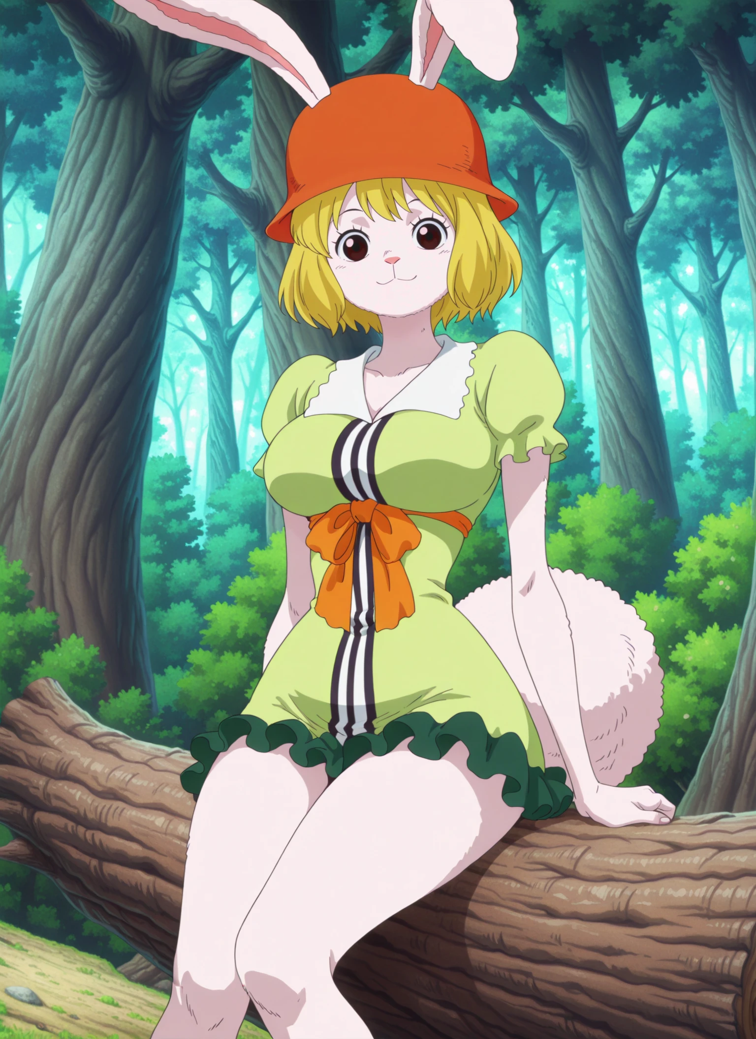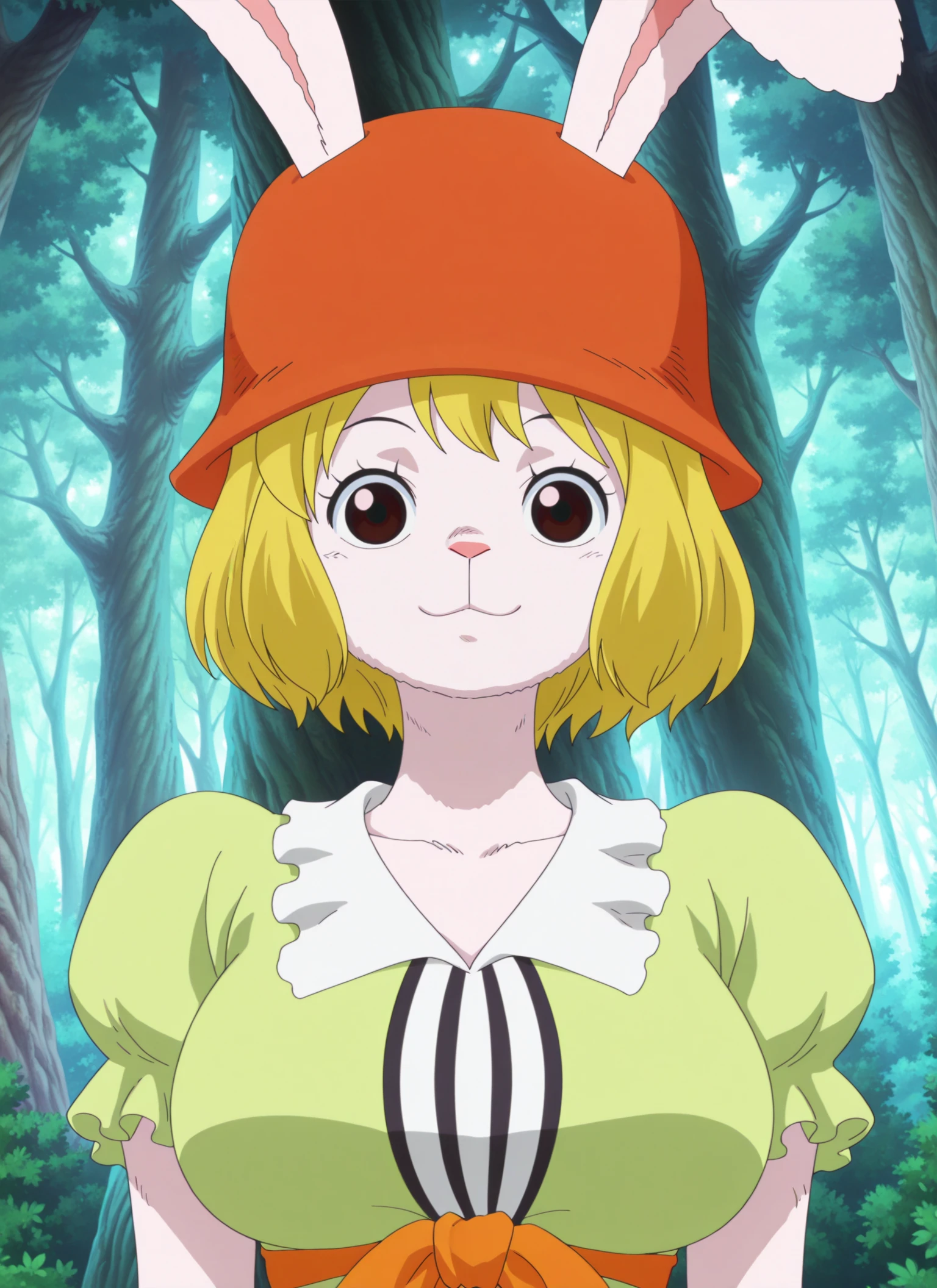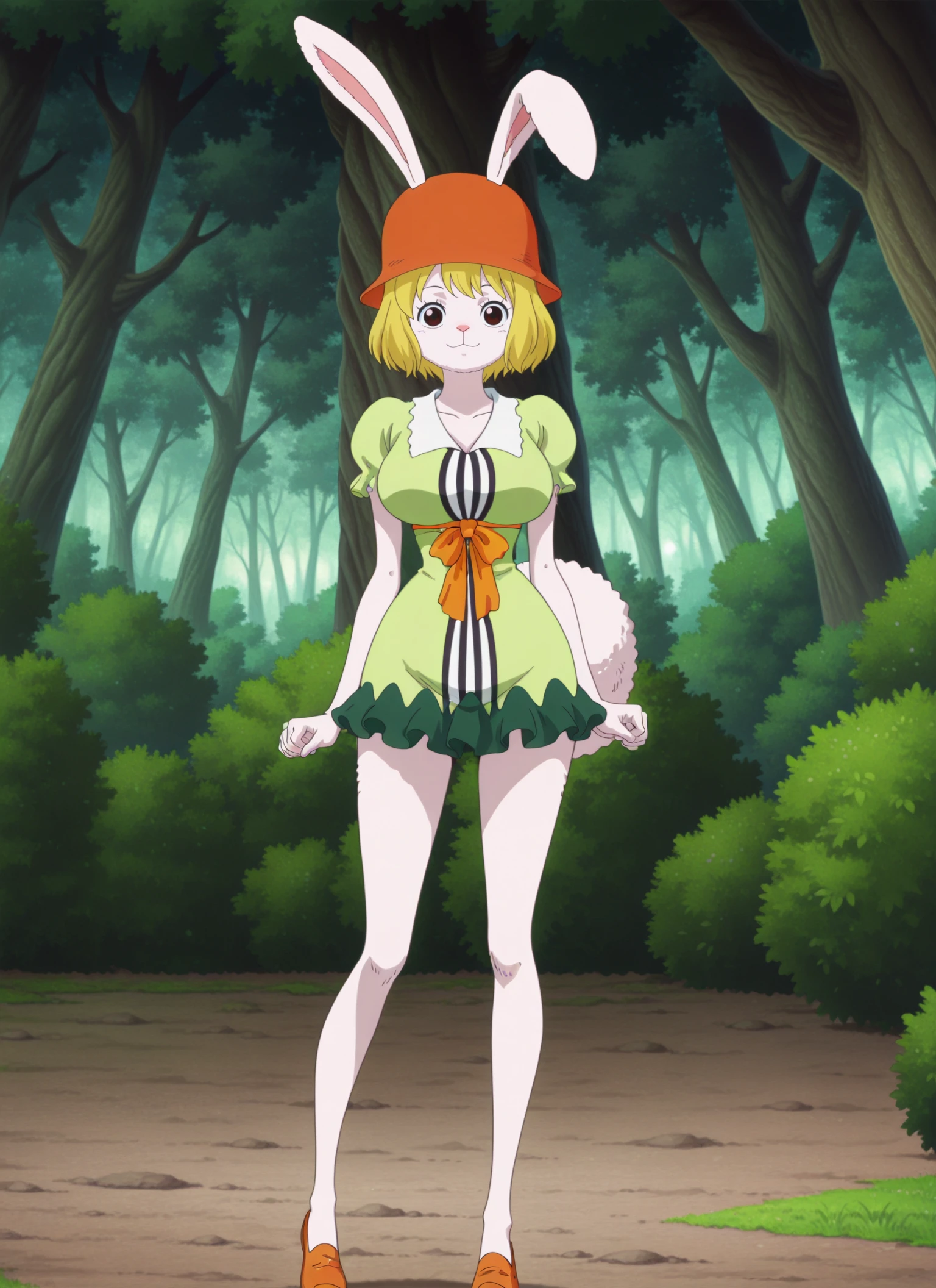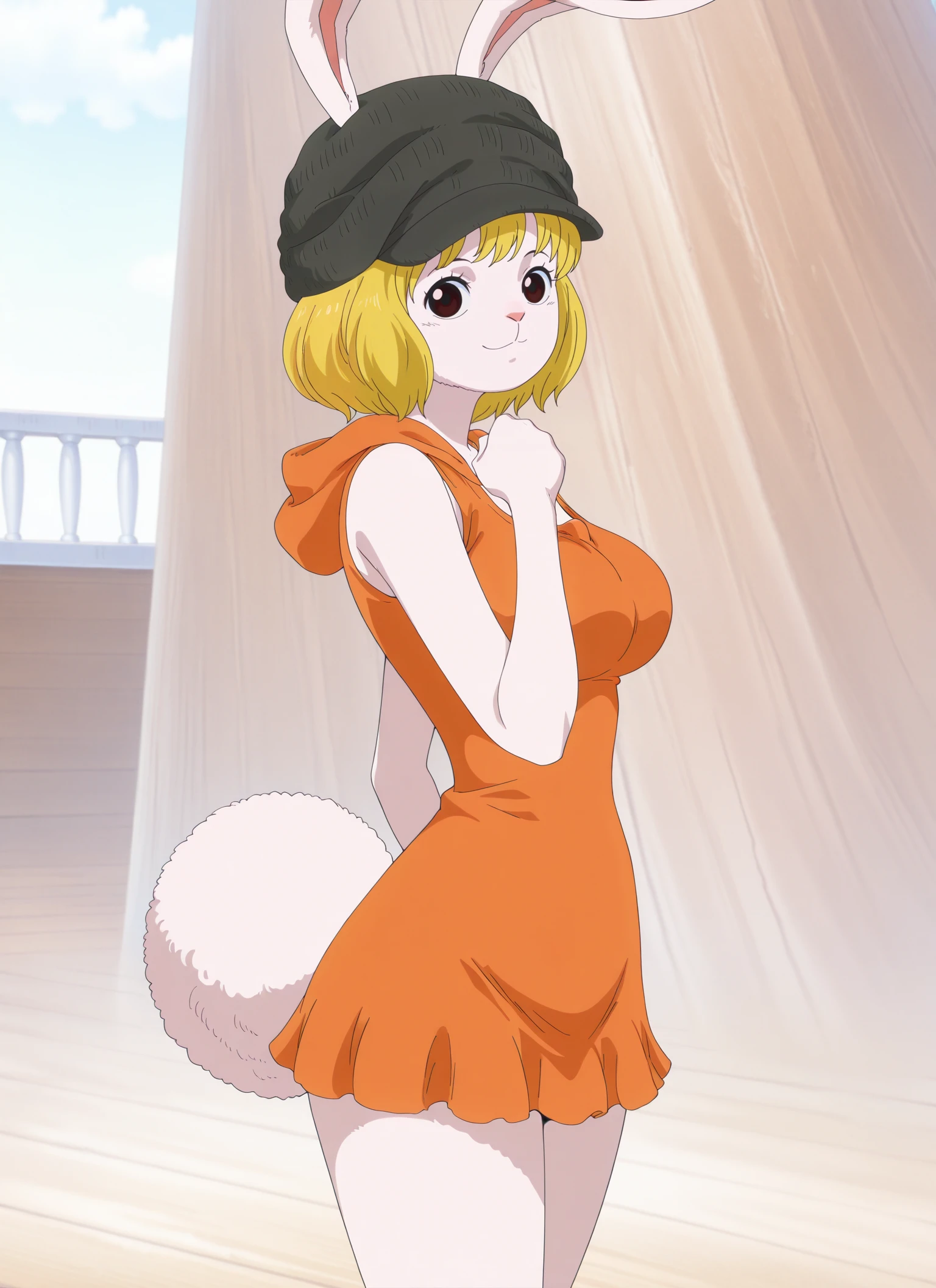 0n3p13c3_c&rr0t, medium breasts, brown eyes, blonde hair, short hair, rabbit girl, rabbit ears, rabbit nose, rabbit tail, white fur,