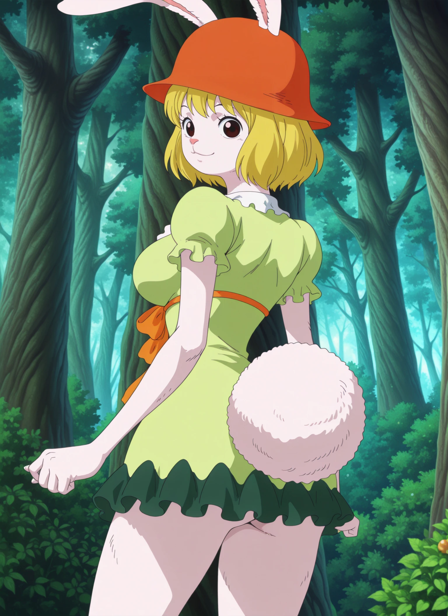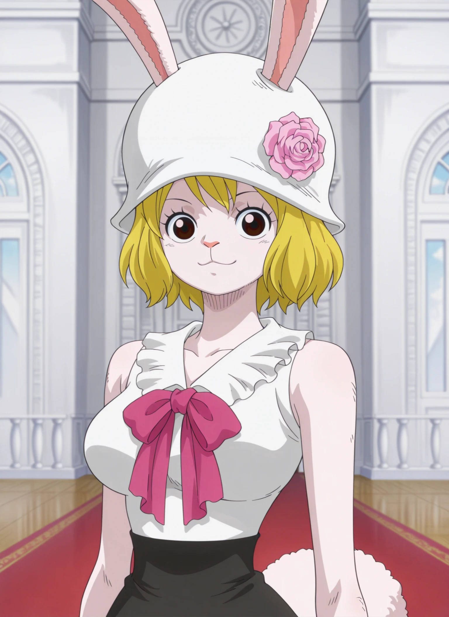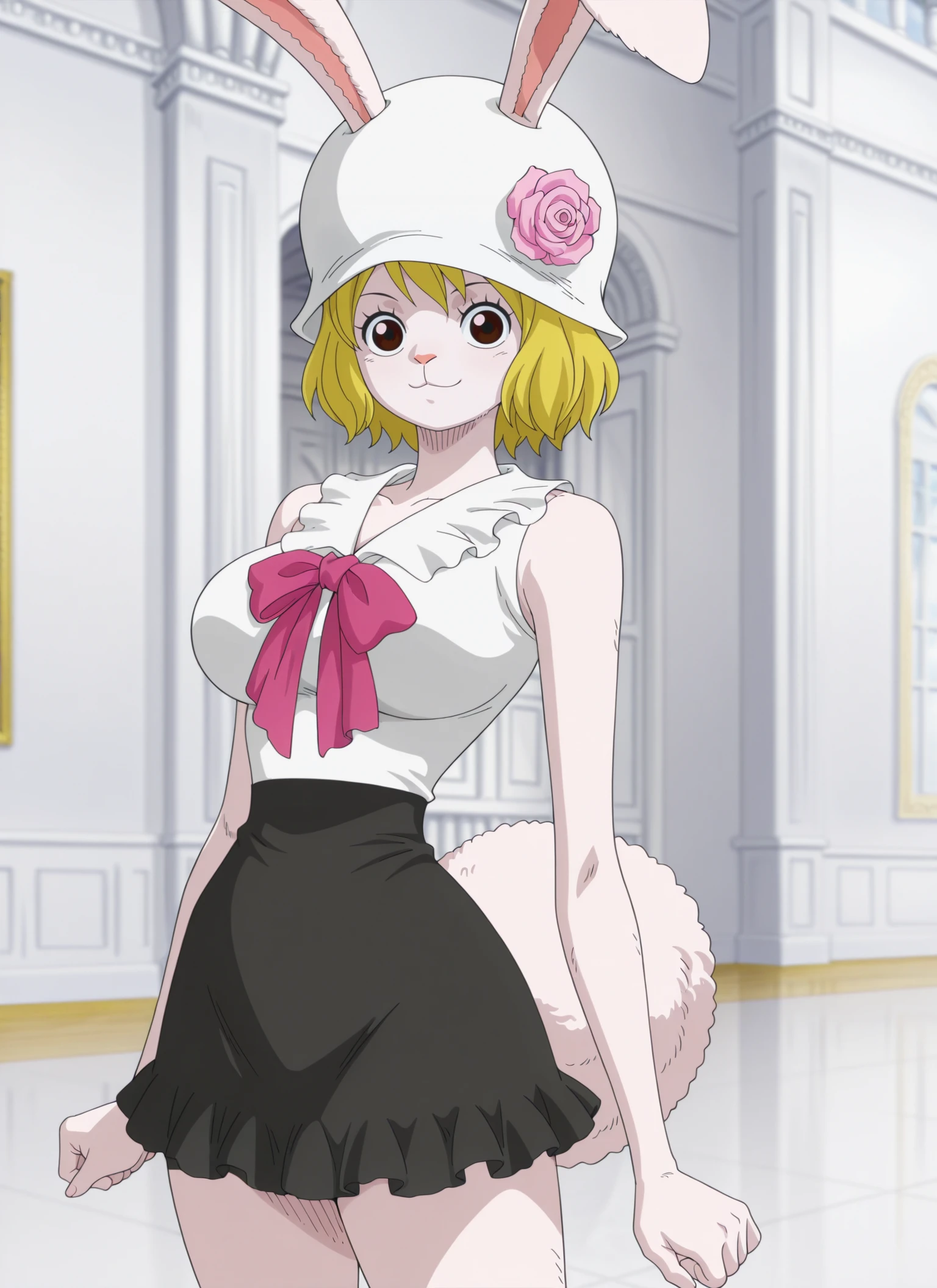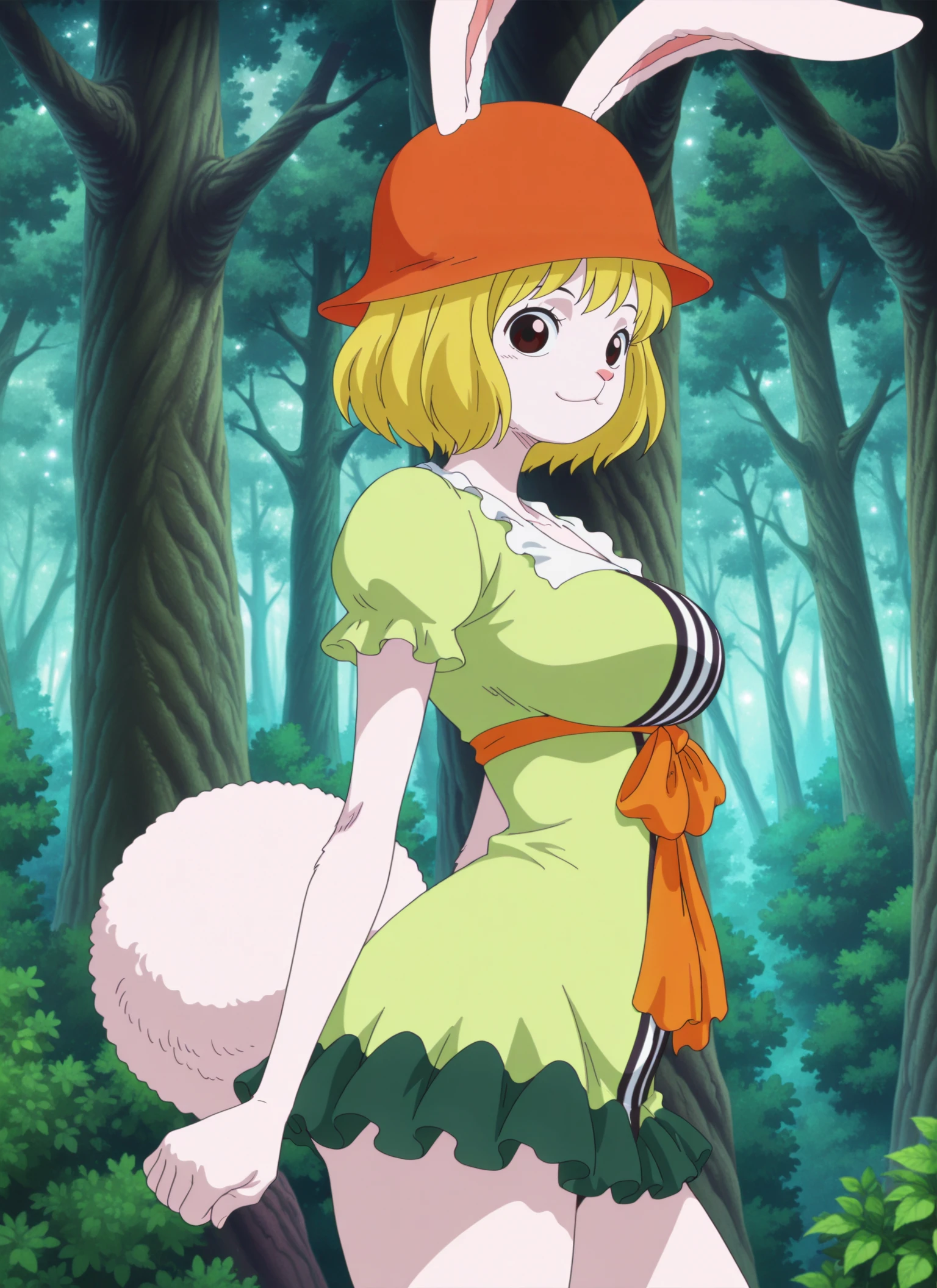 0n3p13c3_c&rr0t, medium breasts, brown eyes, blonde hair, short hair, rabbit girl, rabbit ears, rabbit nose, rabbit tail, white fur,