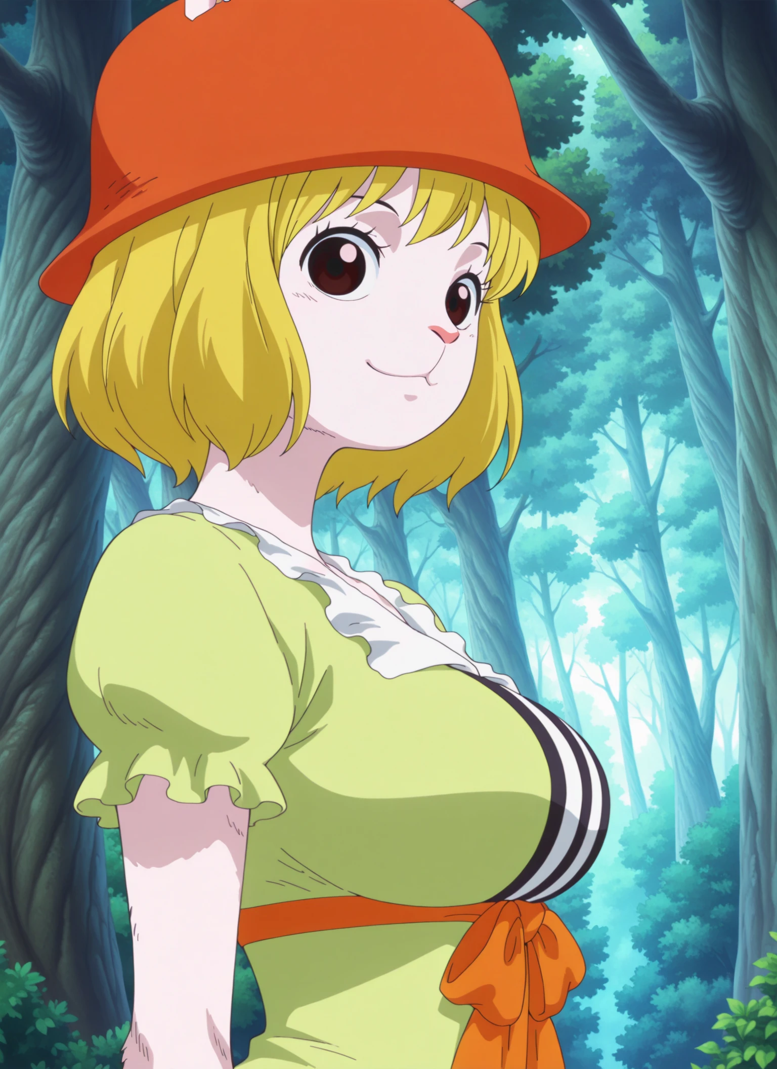c&rr0t_gr33n, orange hat, white frilled neckline, light green dress, puffy short sleeves, vertical stripes, orange bow, frilled dress, dark green hemline, orange loafers,