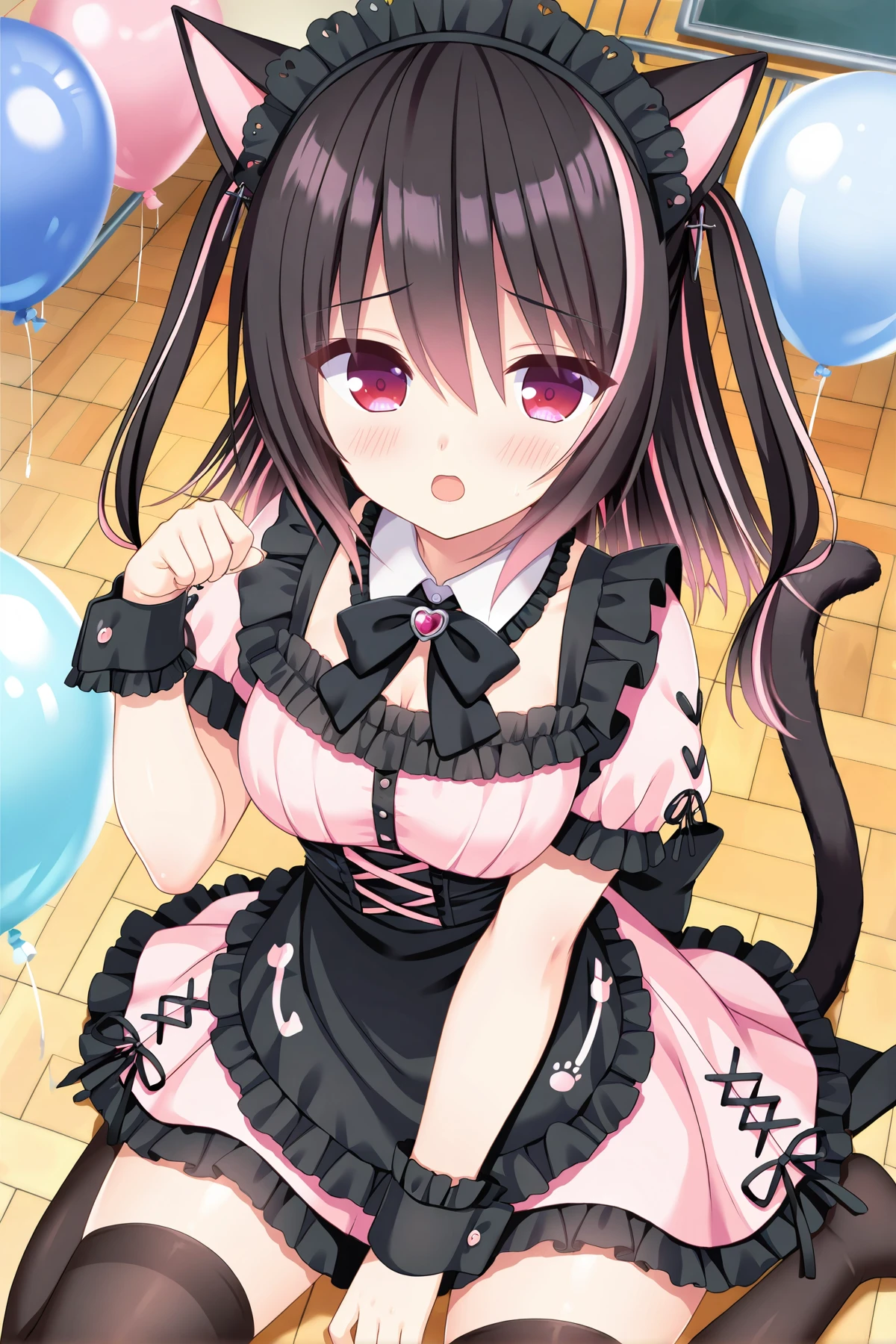 吉祥物:kokoro maid, cat ears, detached collar, maid headdress, bow, black bow, wrist cuffs, short sleeves, puffy sleeves, puffy short sleeves, frills, pink dress, frilled dress, dress, black apron, maid, cat tail, tail, cat girl, black thighhighs, thighhighs