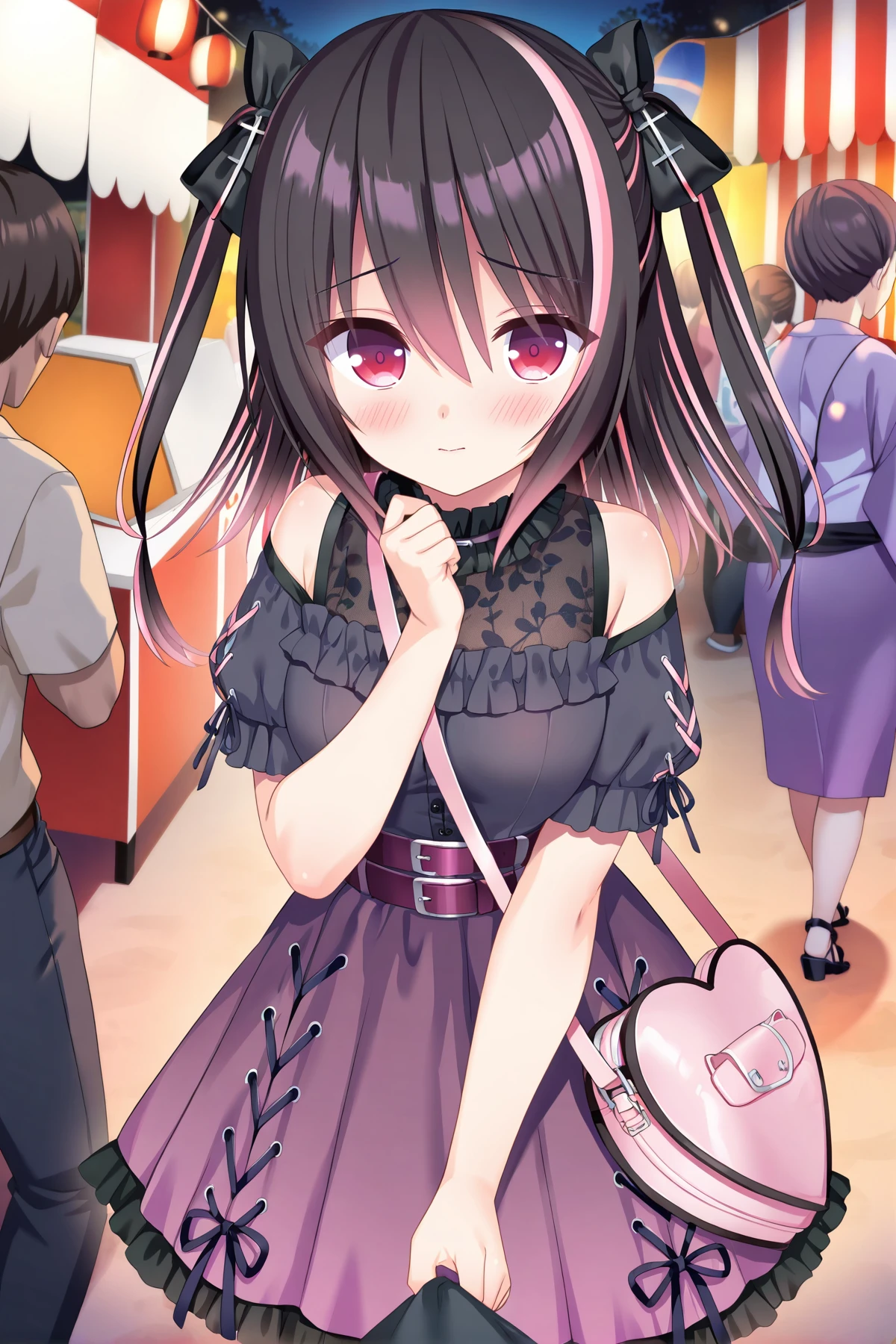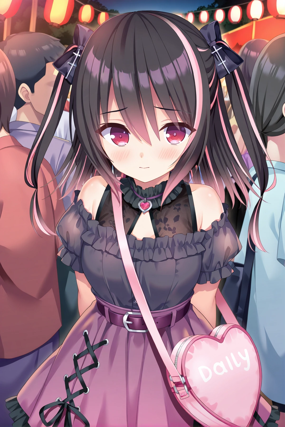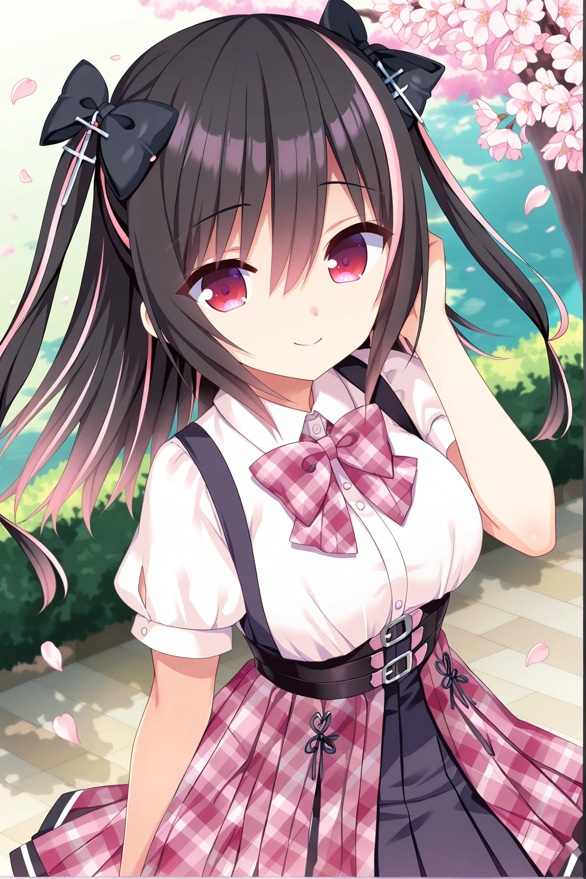 人物特征(地雷妹发型):kokoro,1girl, multicolored hair, black hair, pink hair, long hair, streaked hair,red eyes, two-tone hair,hair between eyes,two side up,hair bow, bow, black bow,