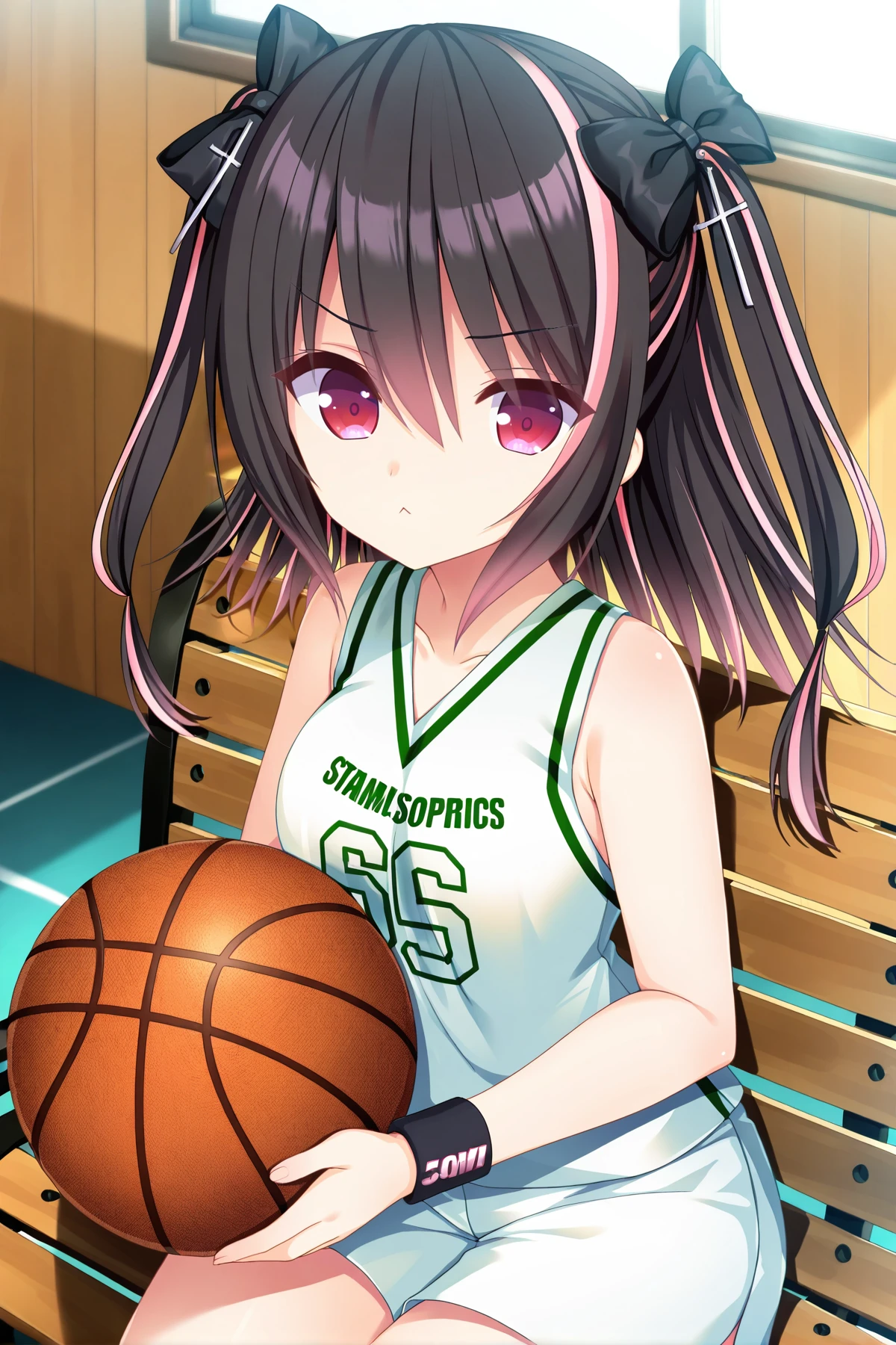 篮球装:kokoro sports, sleeveless, sleeveless shirt, shirt, clothes writing, wristband, basketball uniform, sportswear, bare shoulders, white shorts, short shorts, shorts, white socks, sneakers, black footwear