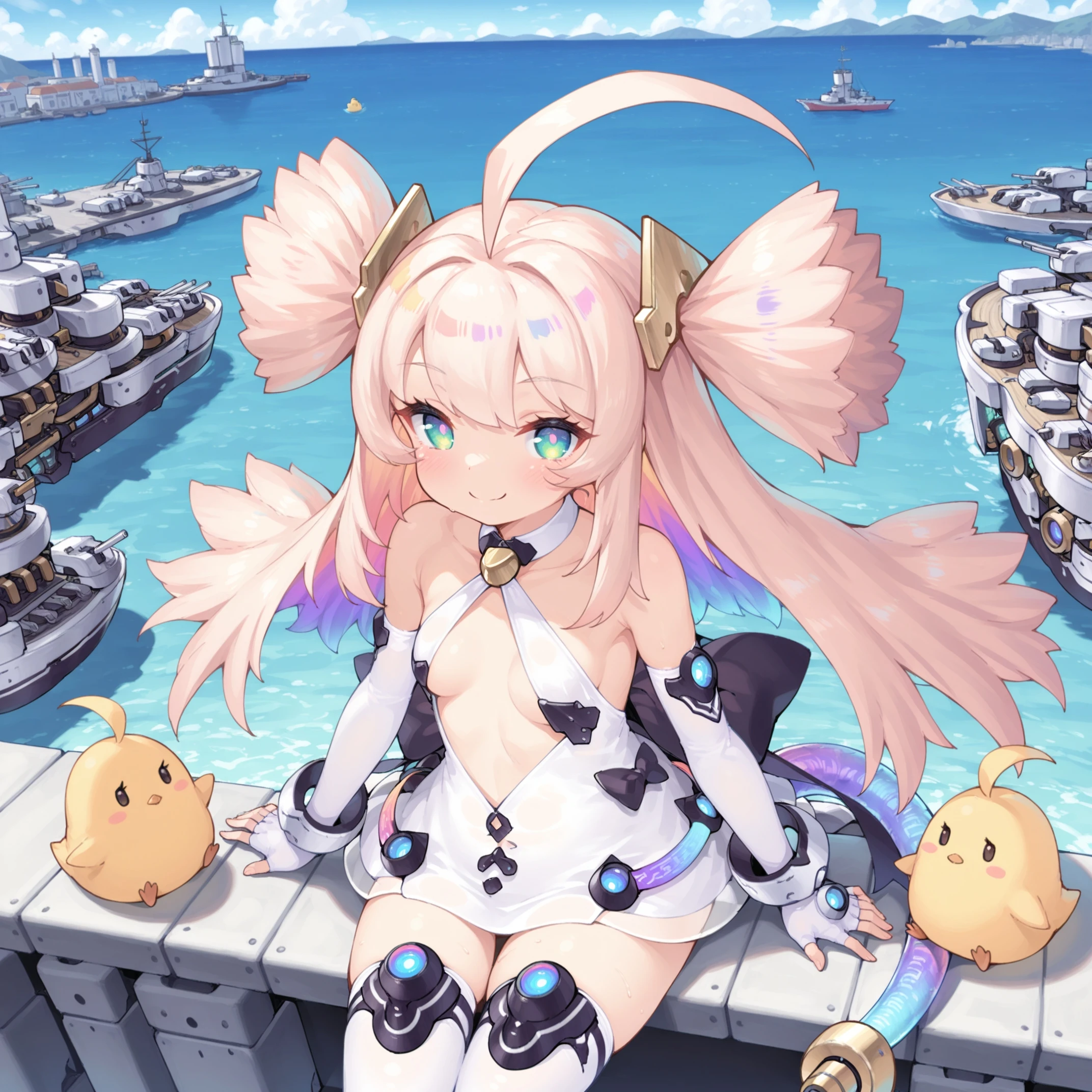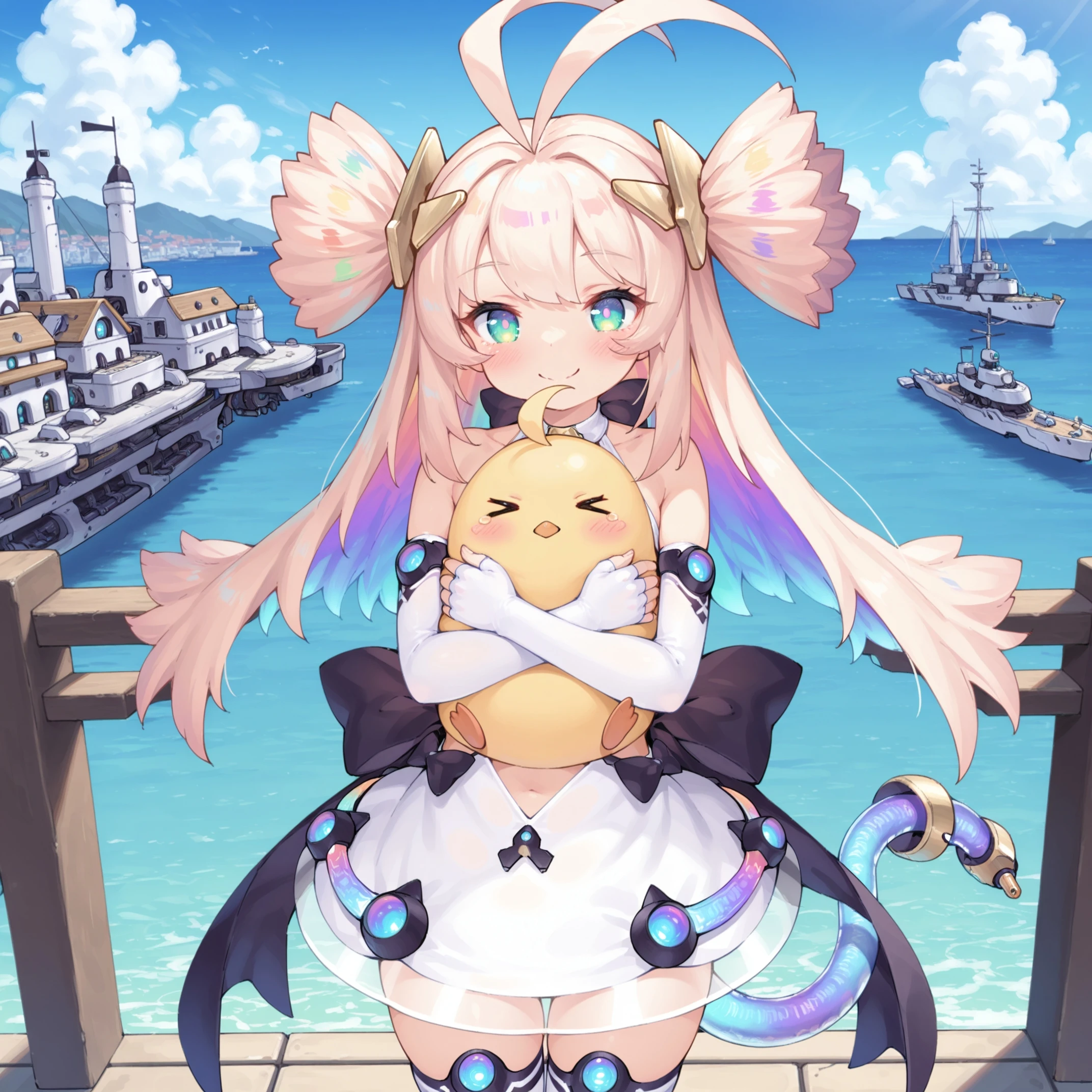 long hair,multicolored hair,blue eyes,green eyes,gold hair ornament, thighhighs,fingerless gloves,elbow gloves,white gloves, white dress,black bow,white halterneck,blue tail,boots