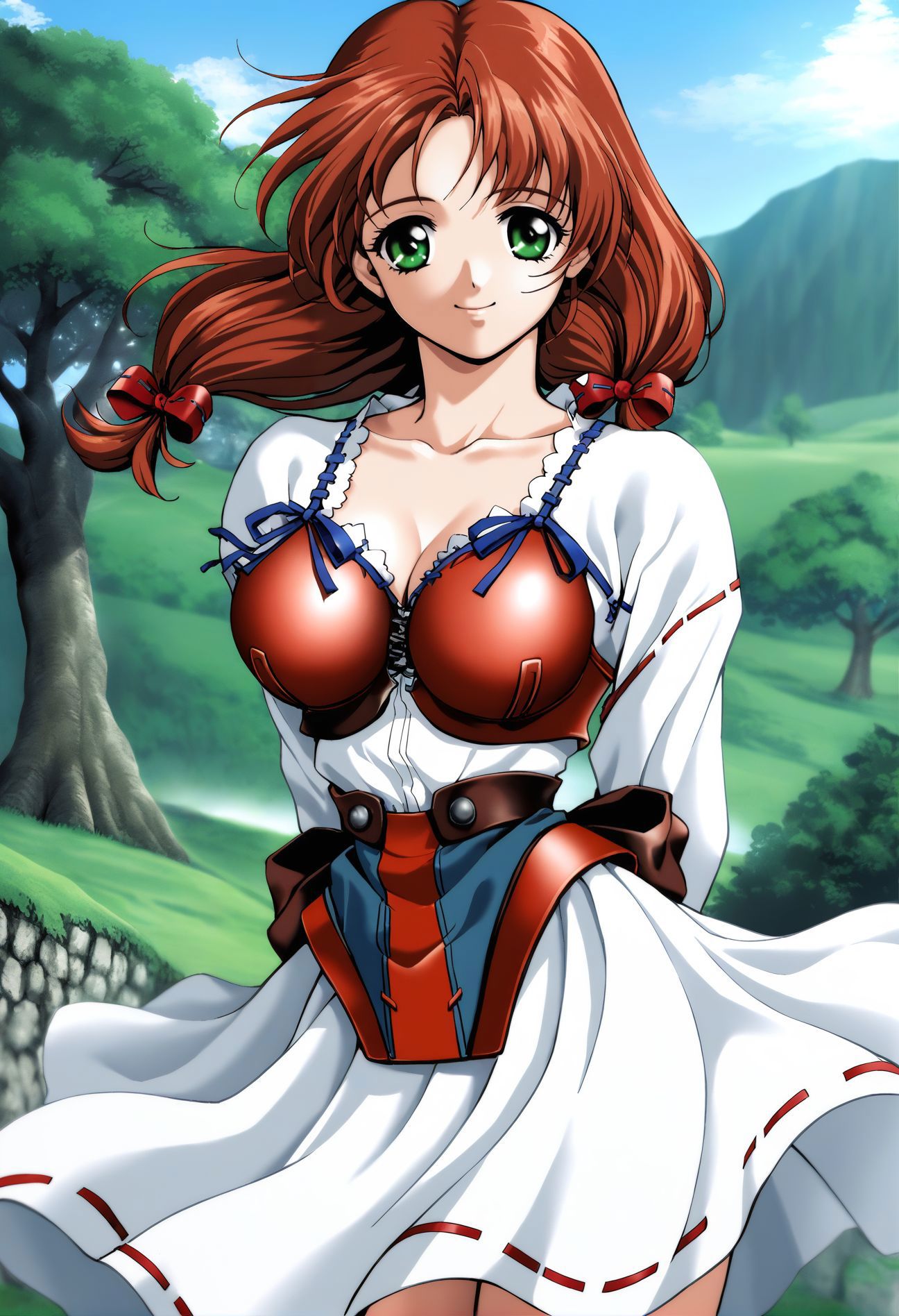 outfit: dress,white skirt,breast plate,ribbon trim,long sleeves,pouch