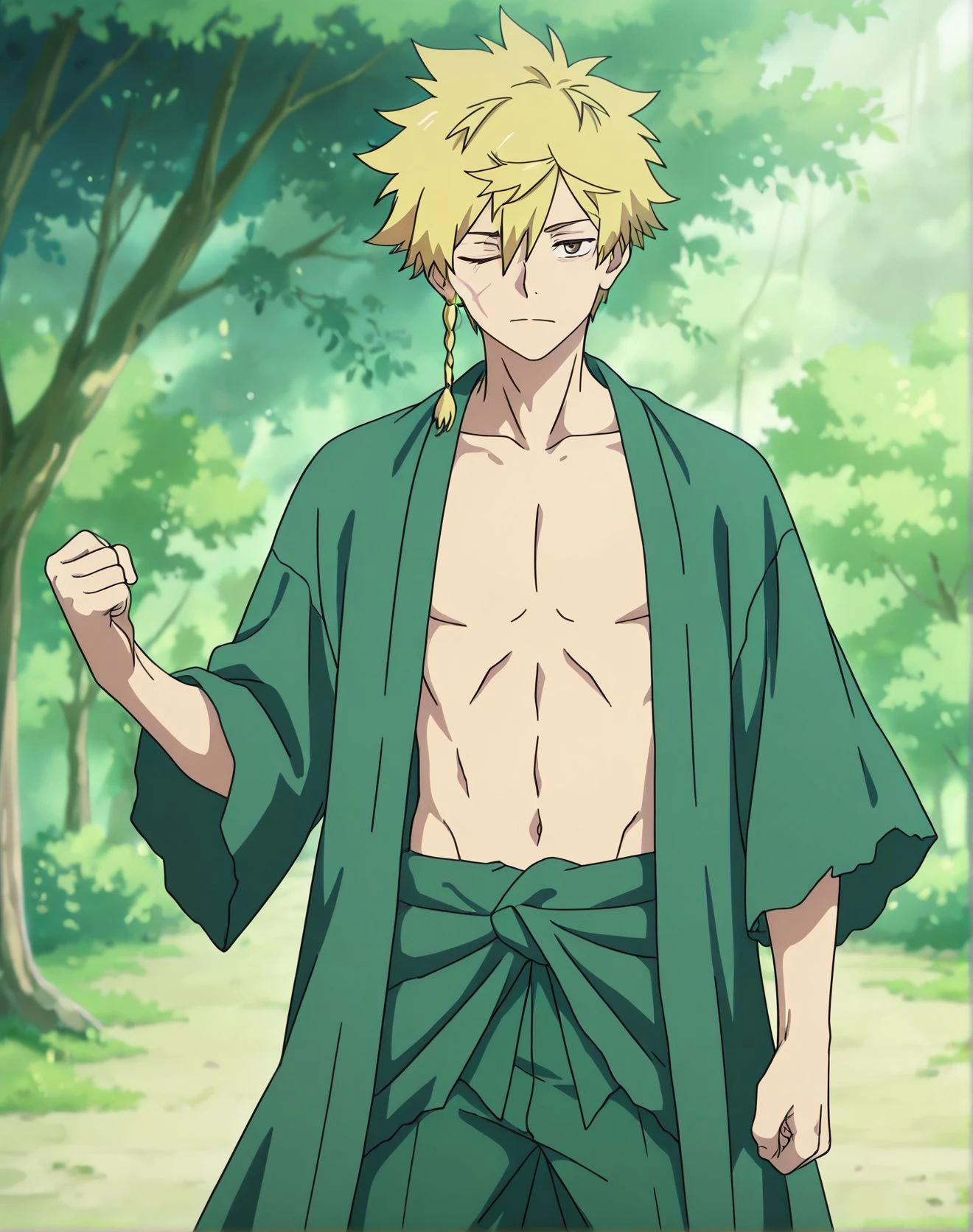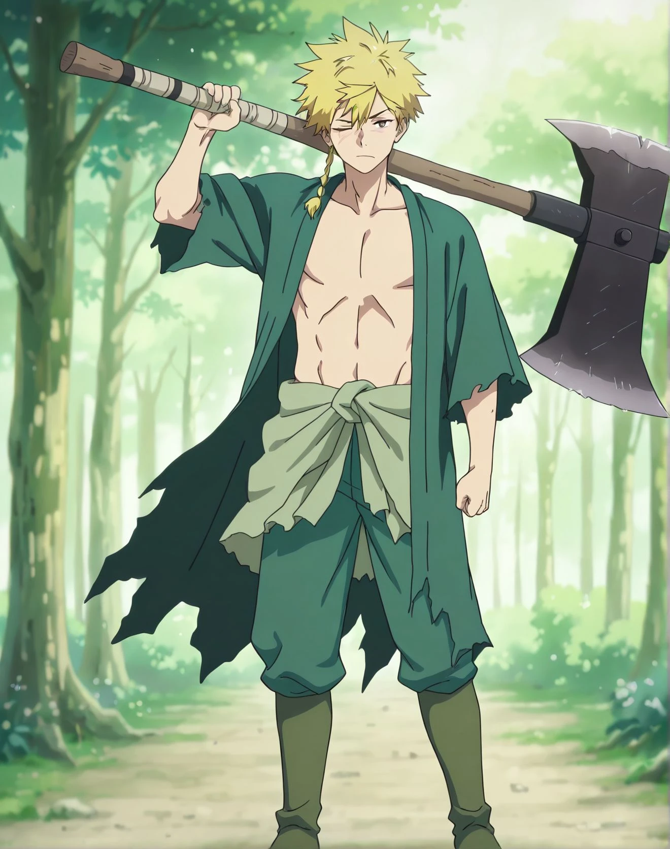 blonde hair,open clothes,green pants, green clothes,