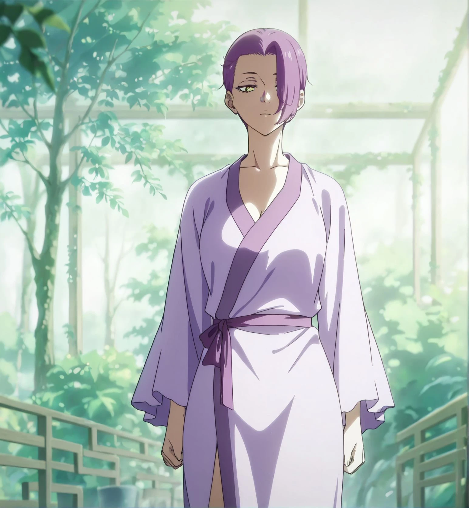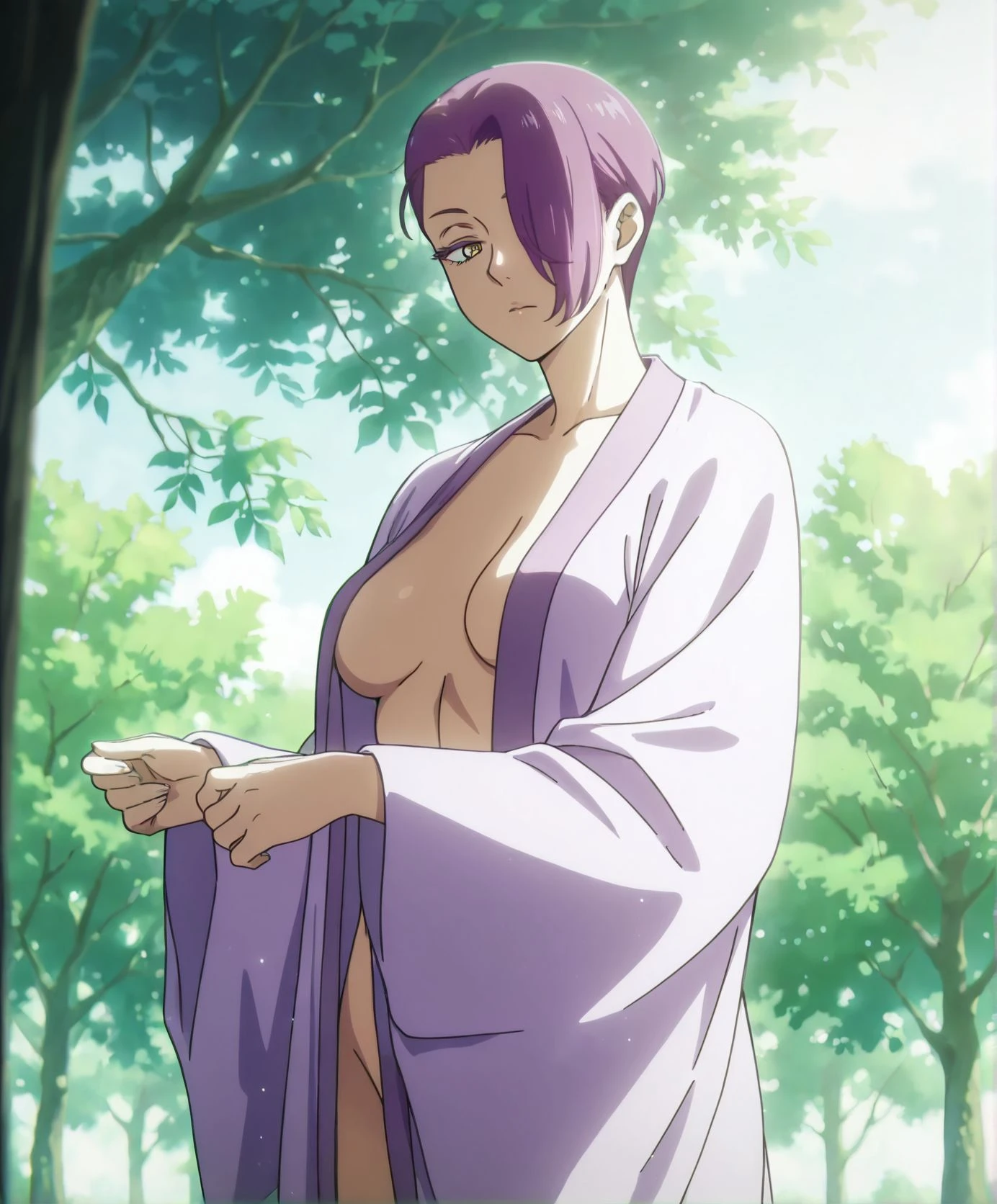 1girl, ren_female,short hair, purple hair, yellow eyes, hair over one eye,