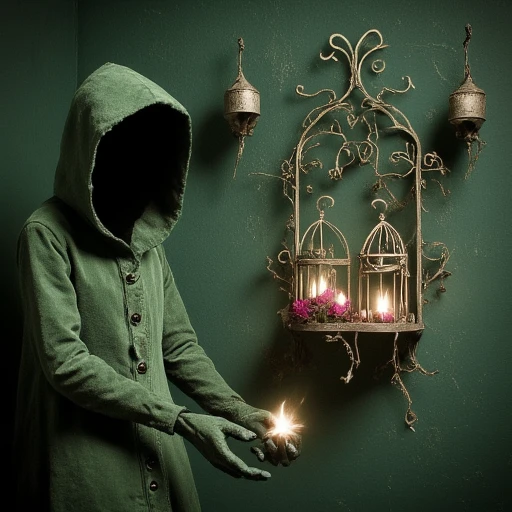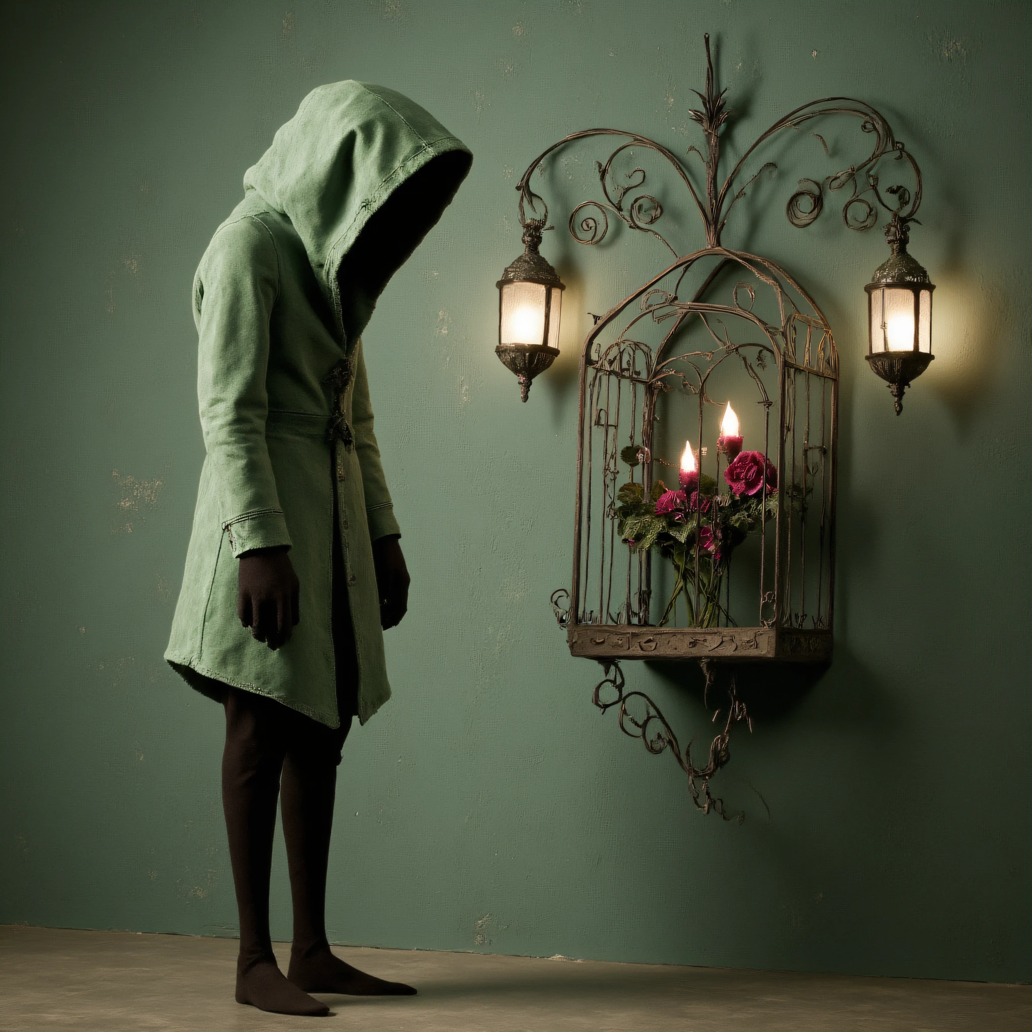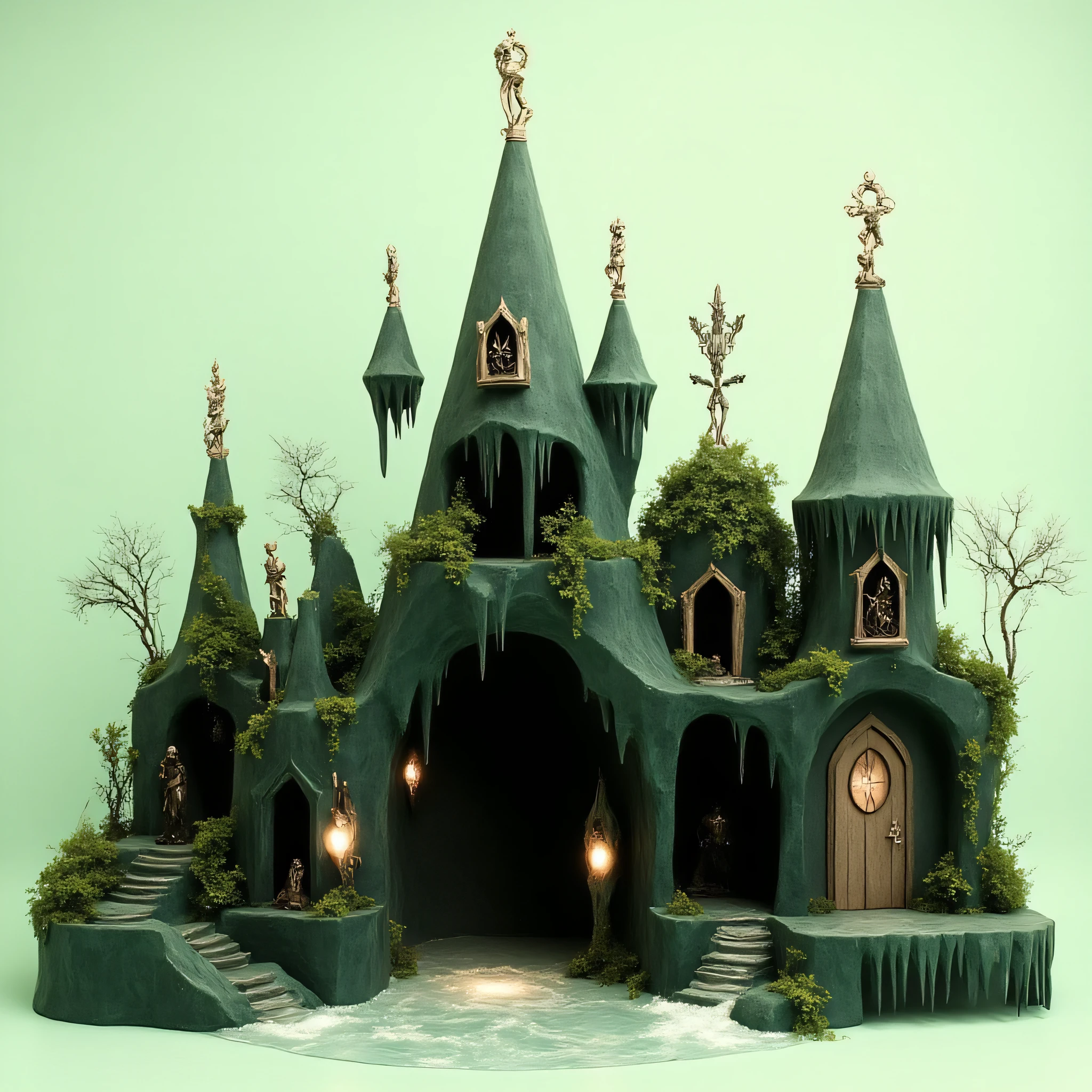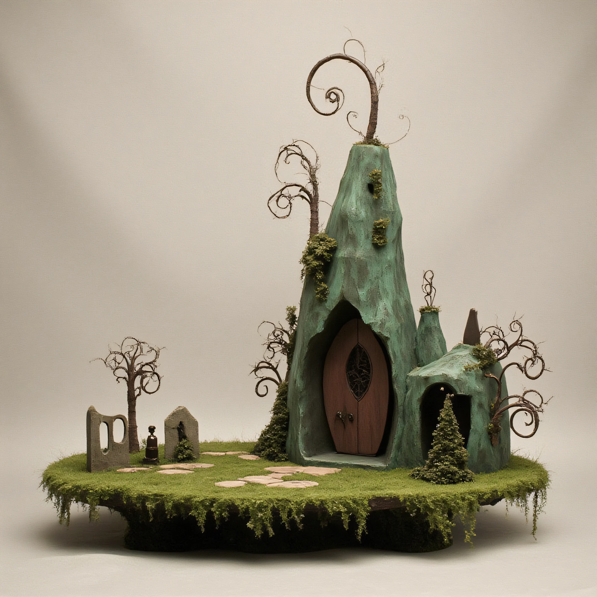 This style highlights soft, textured felt surfaces, intricate costume details, and atmospheric tones dominated by earthy greens, soft grays, and deep burgundies, punctuated by metallic accents.