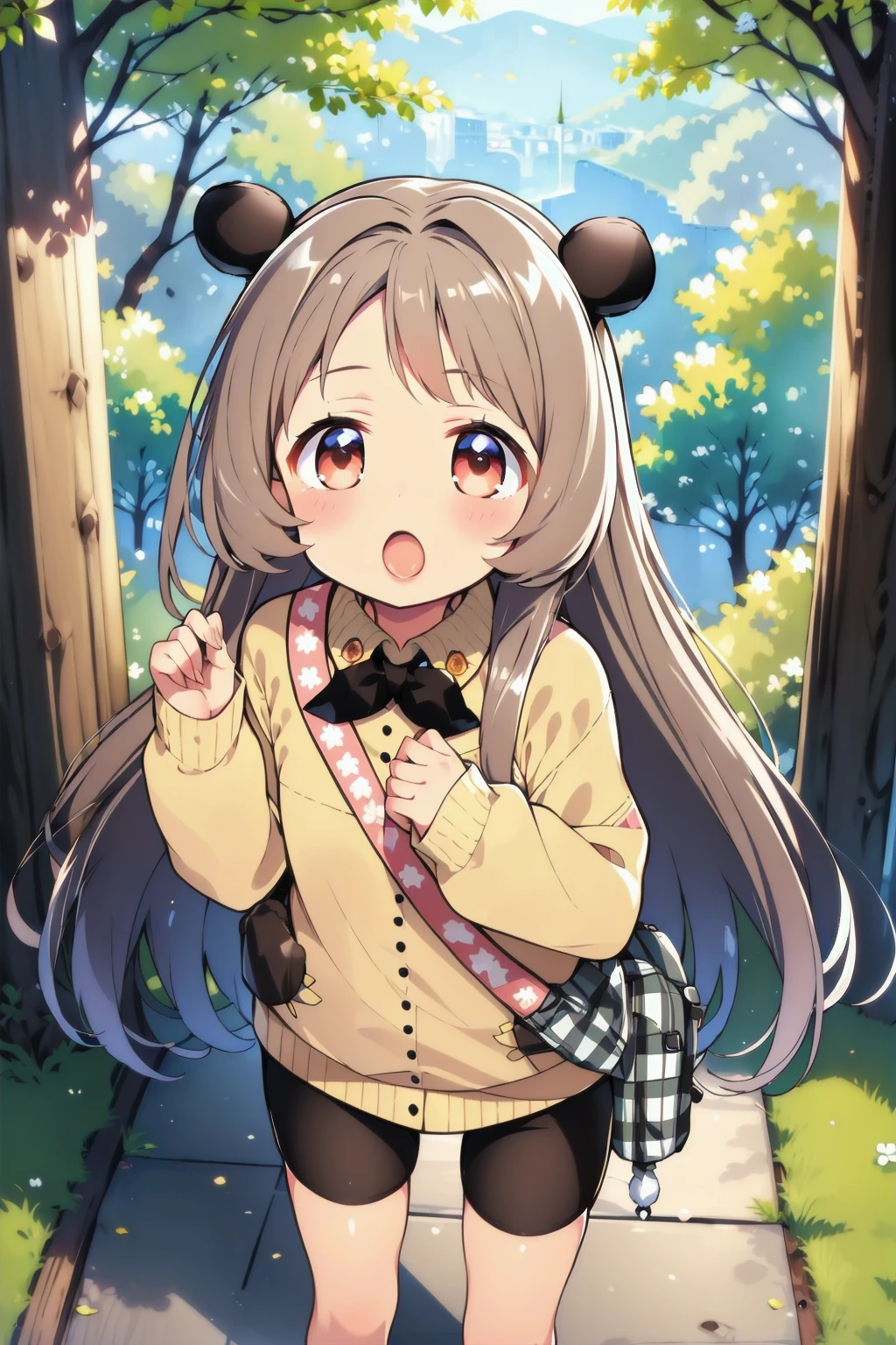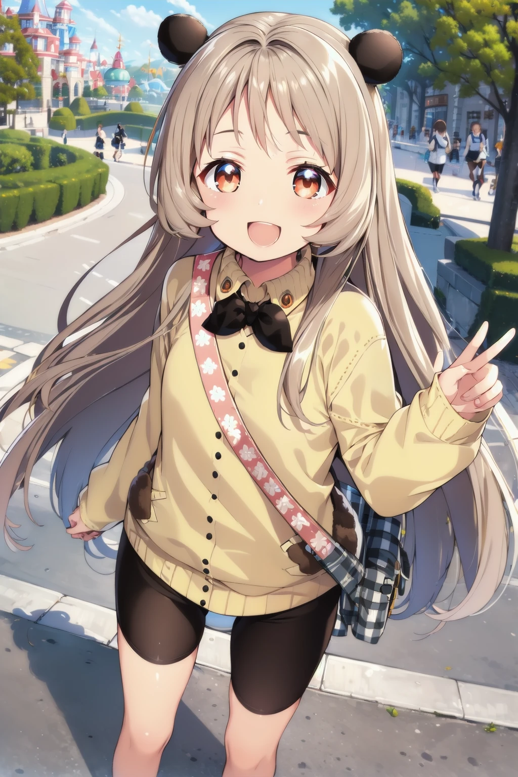 black bear ears, light brown long hair, brown eyes, yellow sweater, bike shorts, shoulder bag