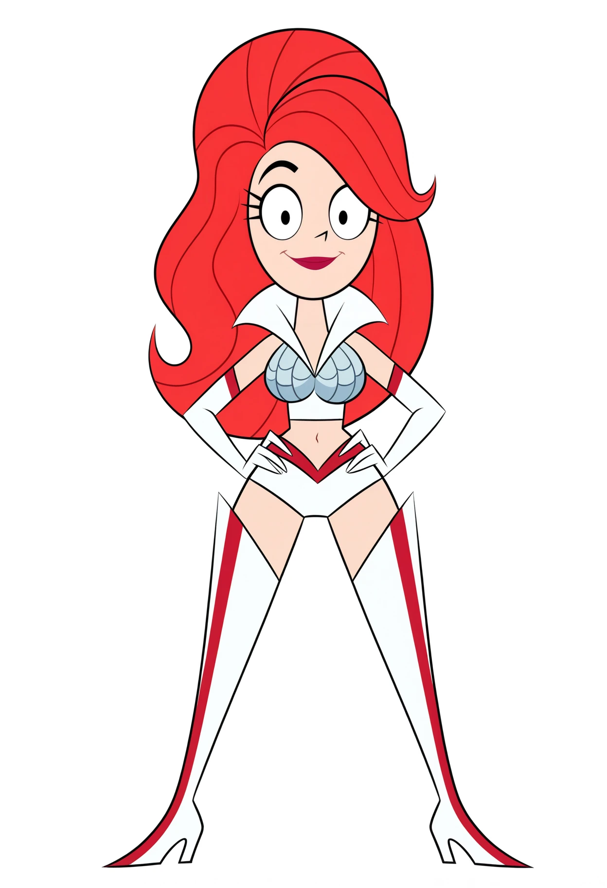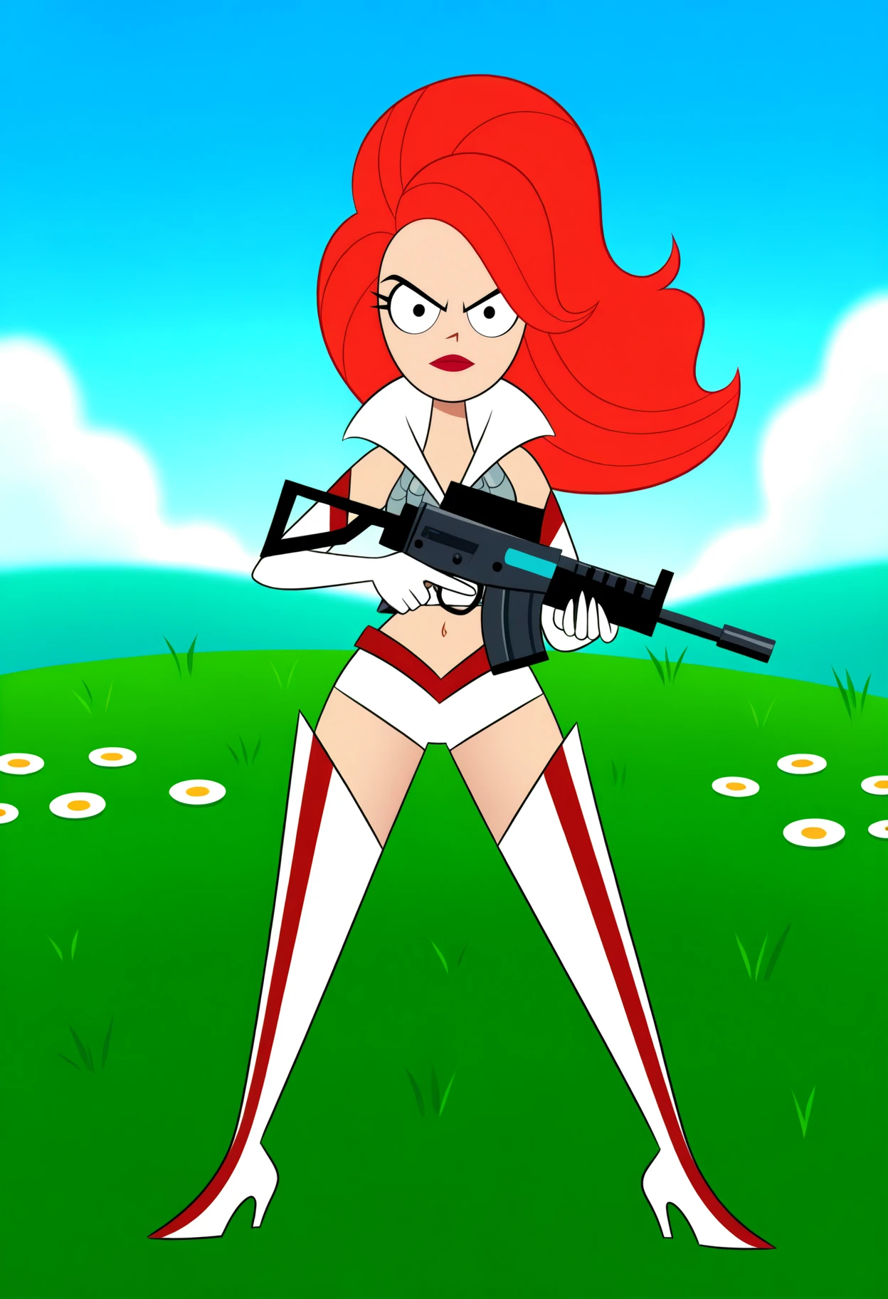 Other prompts : crop top, midriff, white elbow gloves, navel, shorts, thighhighs, white thigh boots, high heel boots