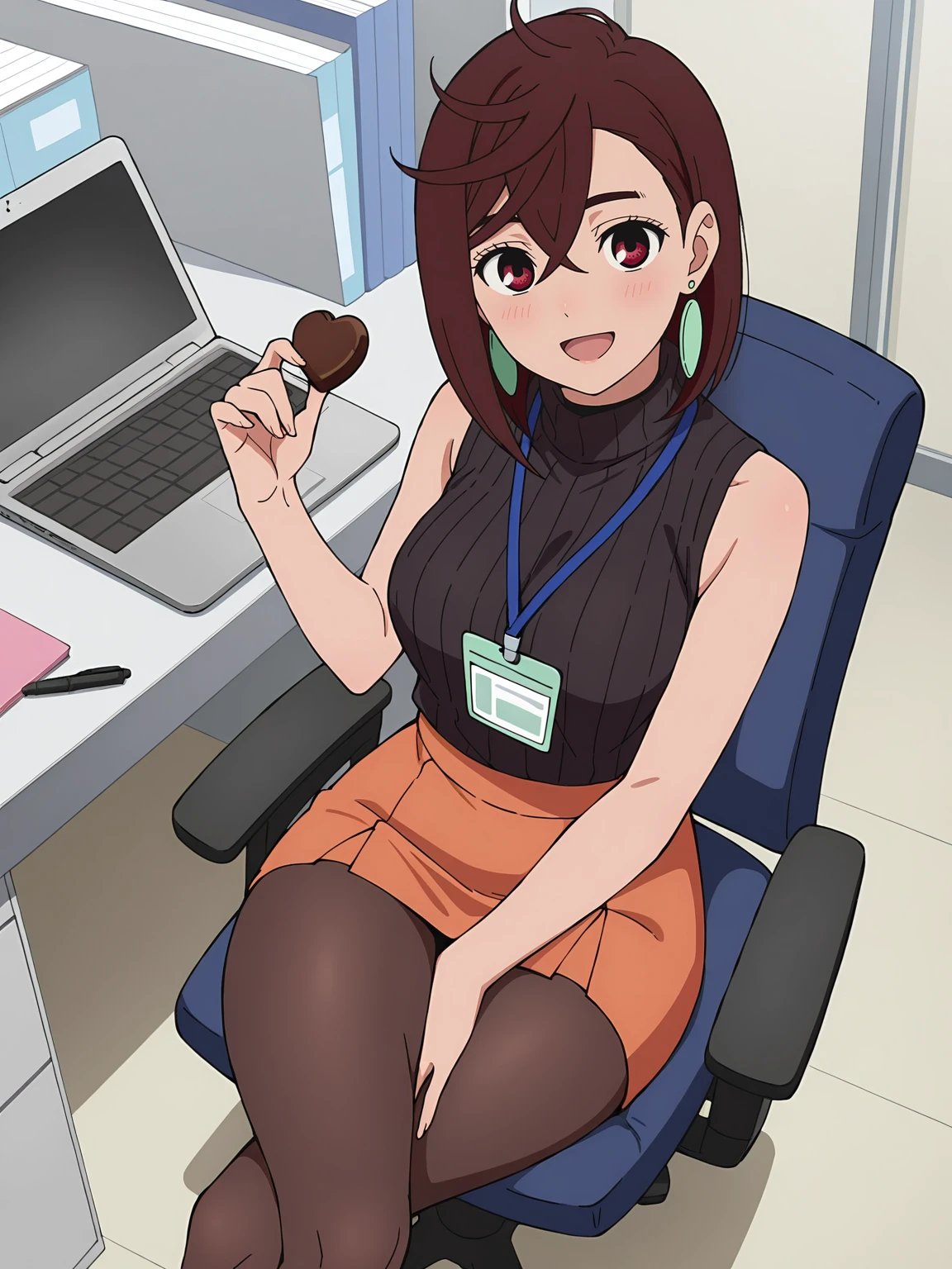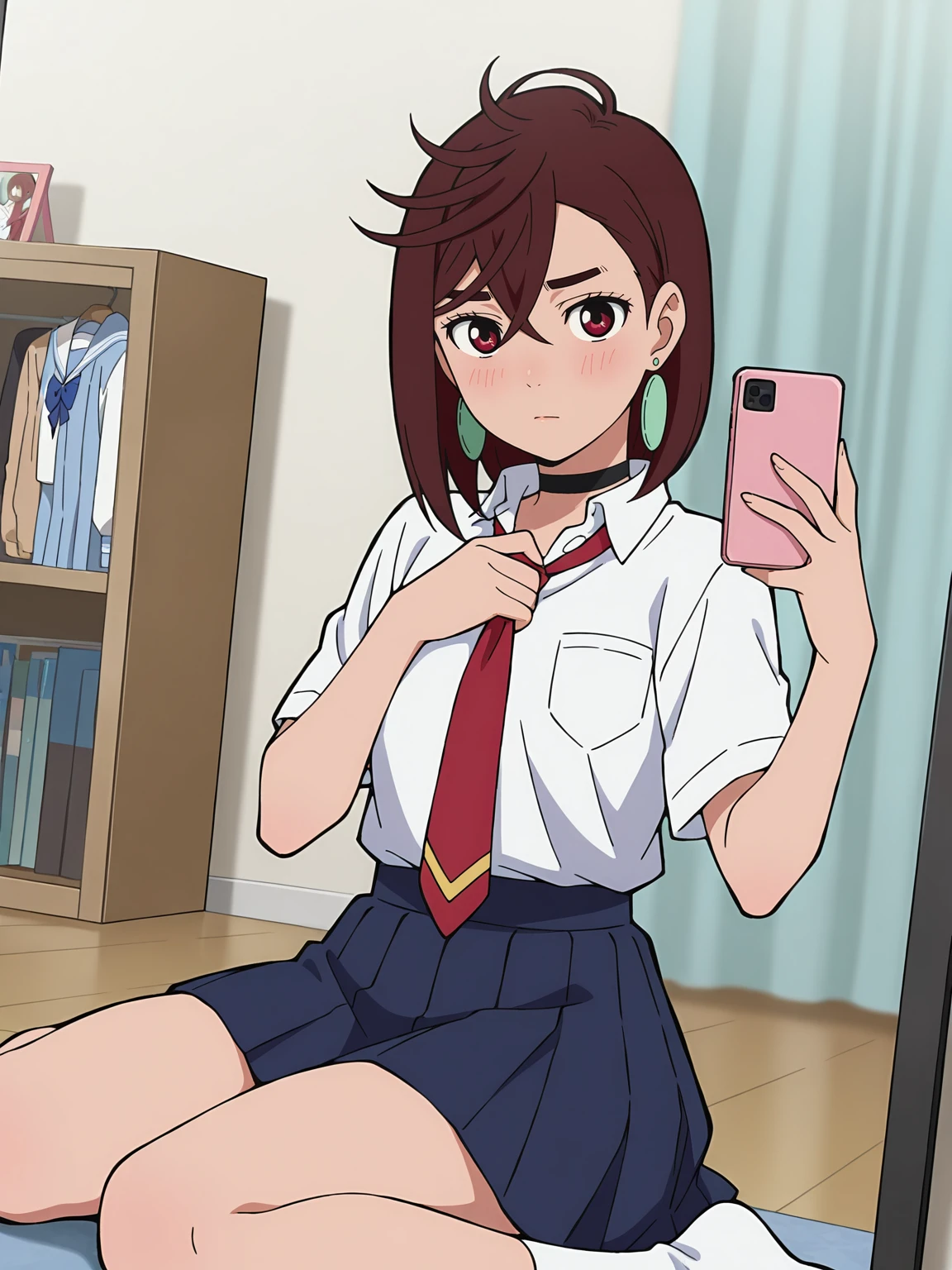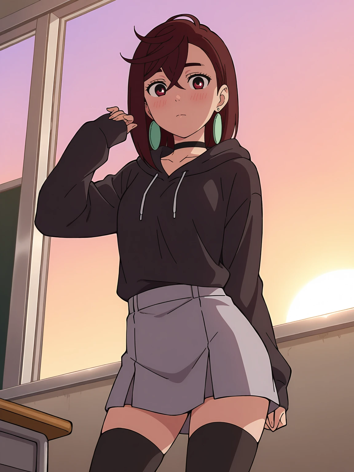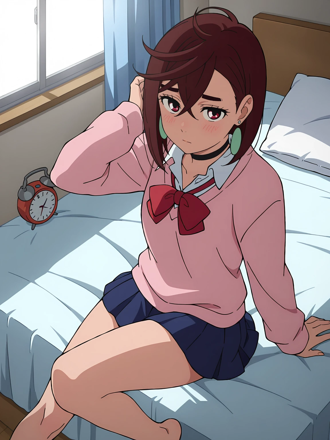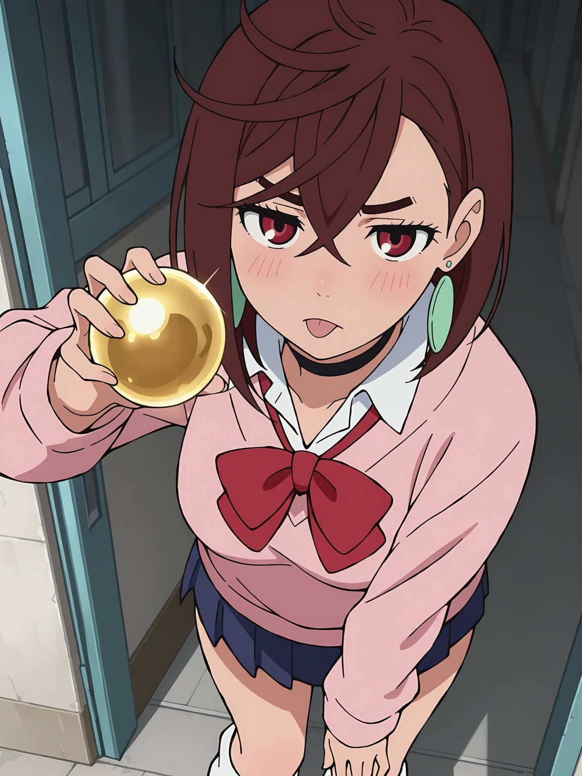 ayase momo, 1girl, solo, brown hair, red eyes, red bowtie, black choker, earrings, long sleeves, pink sweater, miniskirt, leg warmers, loafers, collared shirt