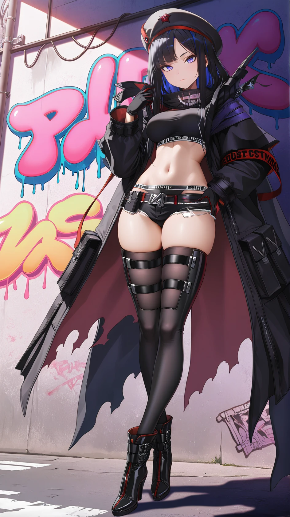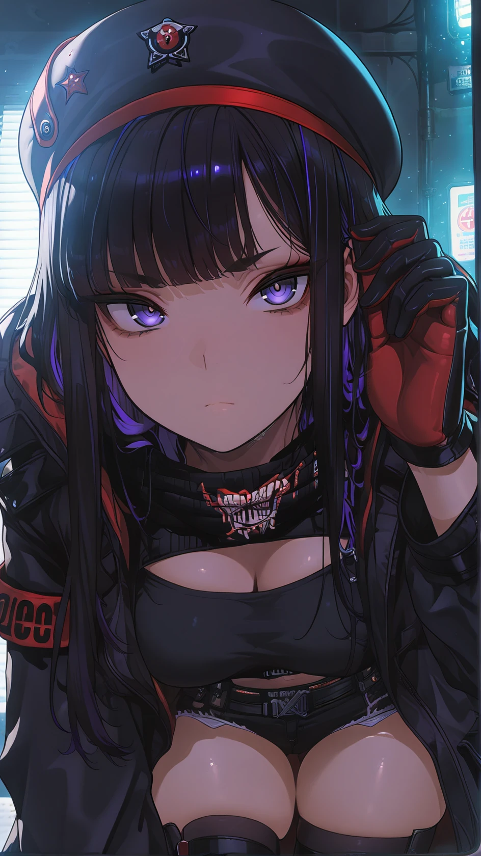 Example prompt : long hair, bangs, blue eyes, shirt, black hair, thighhighs, gloves, long sleeves, hat, navel, purple eyes, jacket, thighs, multicolored hair, boots, open clothes, shorts, midriff, belt, black thighhighs, stomach, bag, black footwear, high heels, open jacket, streaked hair, black jacket, crop top, short shorts, black headwear, skindentation, thigh strap, beret, black shorts, red gloves, high heel boots, black coat, micro shorts, , two-tone gloves,