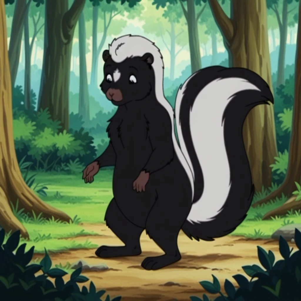 skunkfrnklnilv2, feral, female skunk, black eyes, black fur, white hair