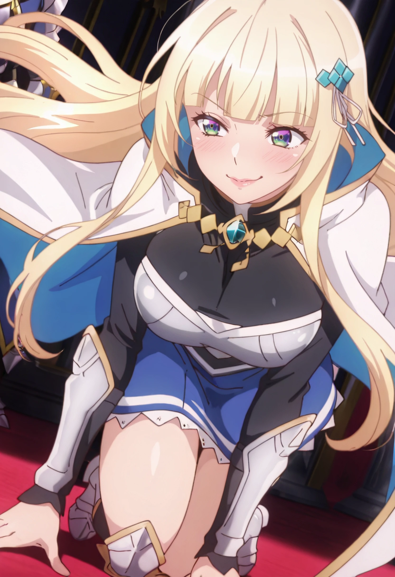 OWSChristina, blonde hair, long hair, very long hair, blunt bangs, hair ornament, multicolored eyes, green eyes, blue eyes, purple eyes,