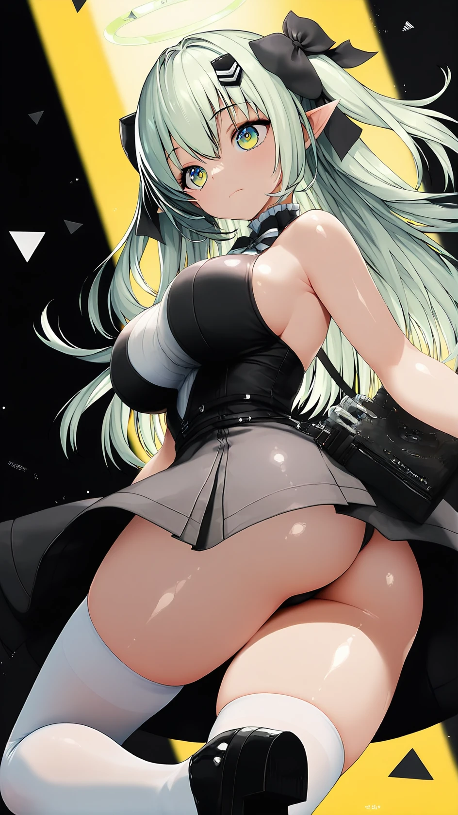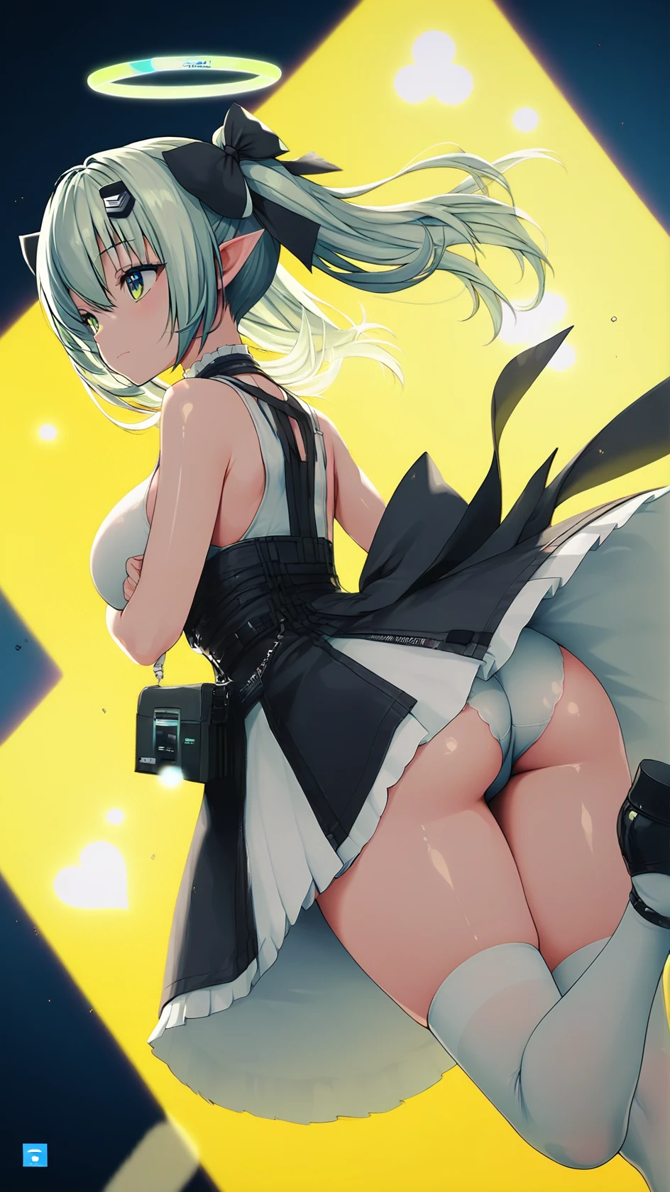 Example prompt : long hair, breasts, bangs, large breasts, hair ornament, thighhighs, dress, bow, hair between eyes, bare shoulders, green eyes, hair bow, green hair, sleeveless, pointy ears, black footwear, white thighhighs, two side up, zettai ryouiki, black bow, sleeveless dress, halo, green bow, id card