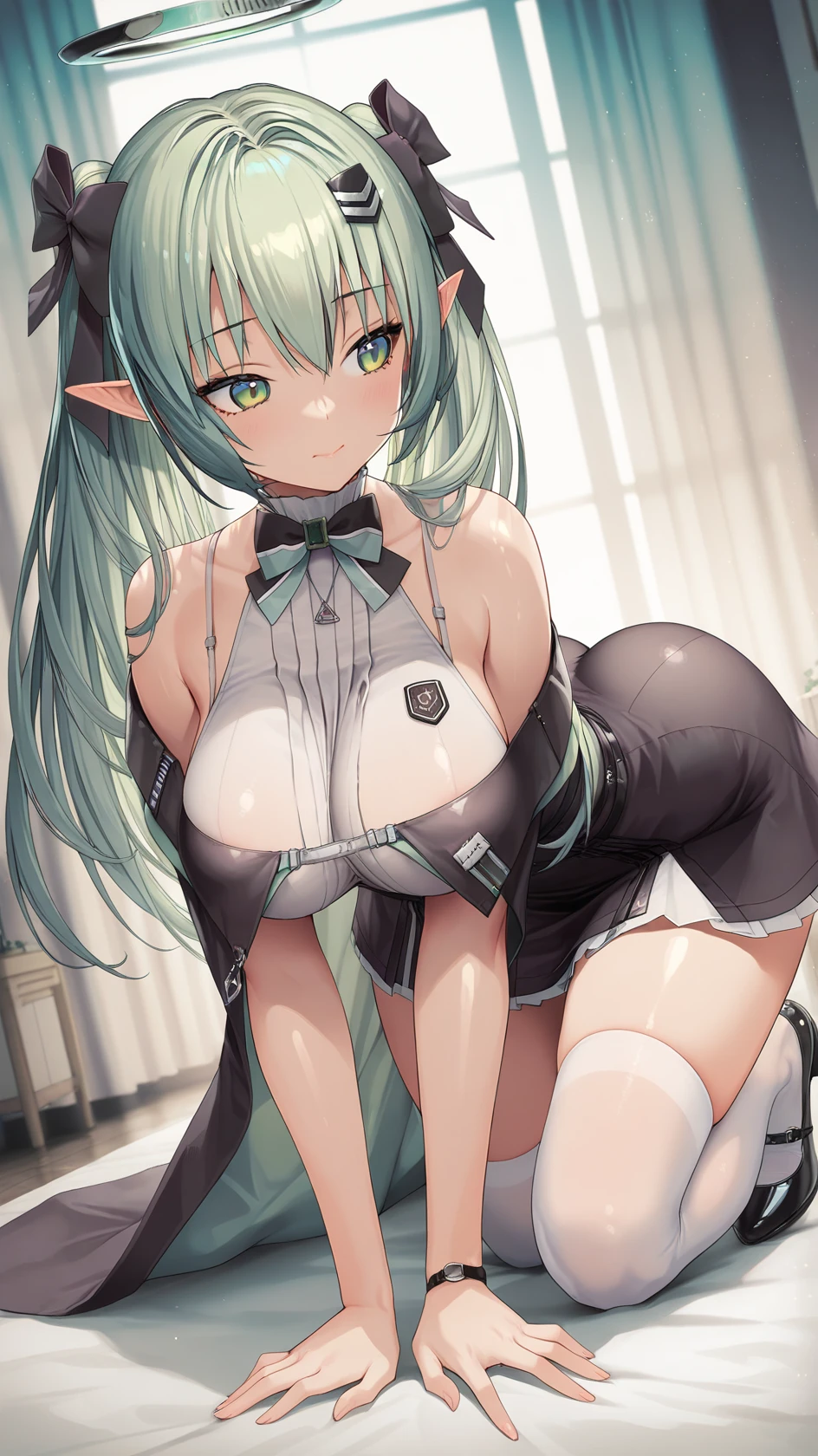 long hair, breasts, bangs, large breasts, hair ornament, thighhighs, dress, bow, hair between eyes, bare shoulders, green eyes, hair bow, green hair, sleeveless, pointy ears, black footwear, white thighhighs, two side up, zettai ryouiki, black bow, sleeveless dress, halo, green bow, id card