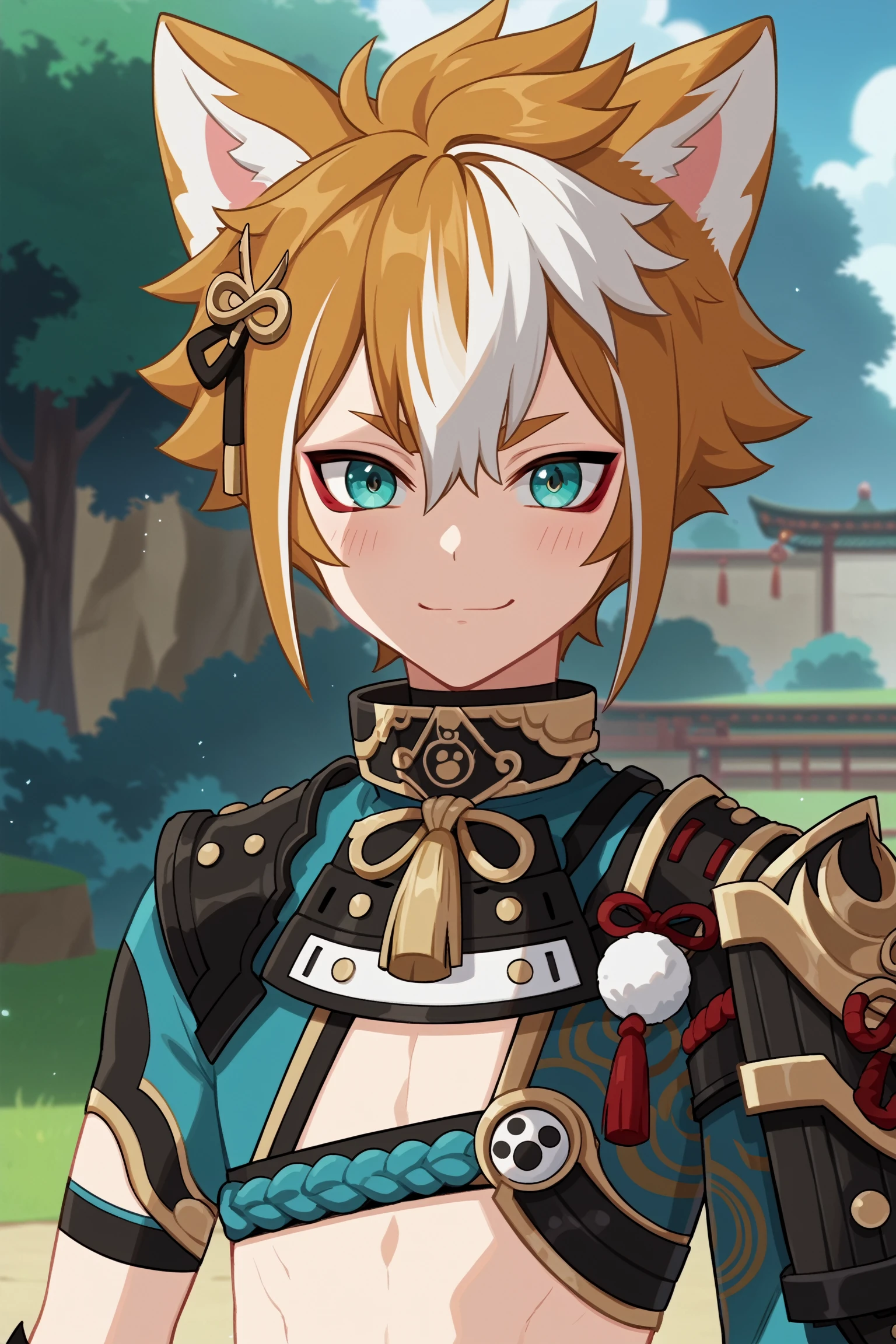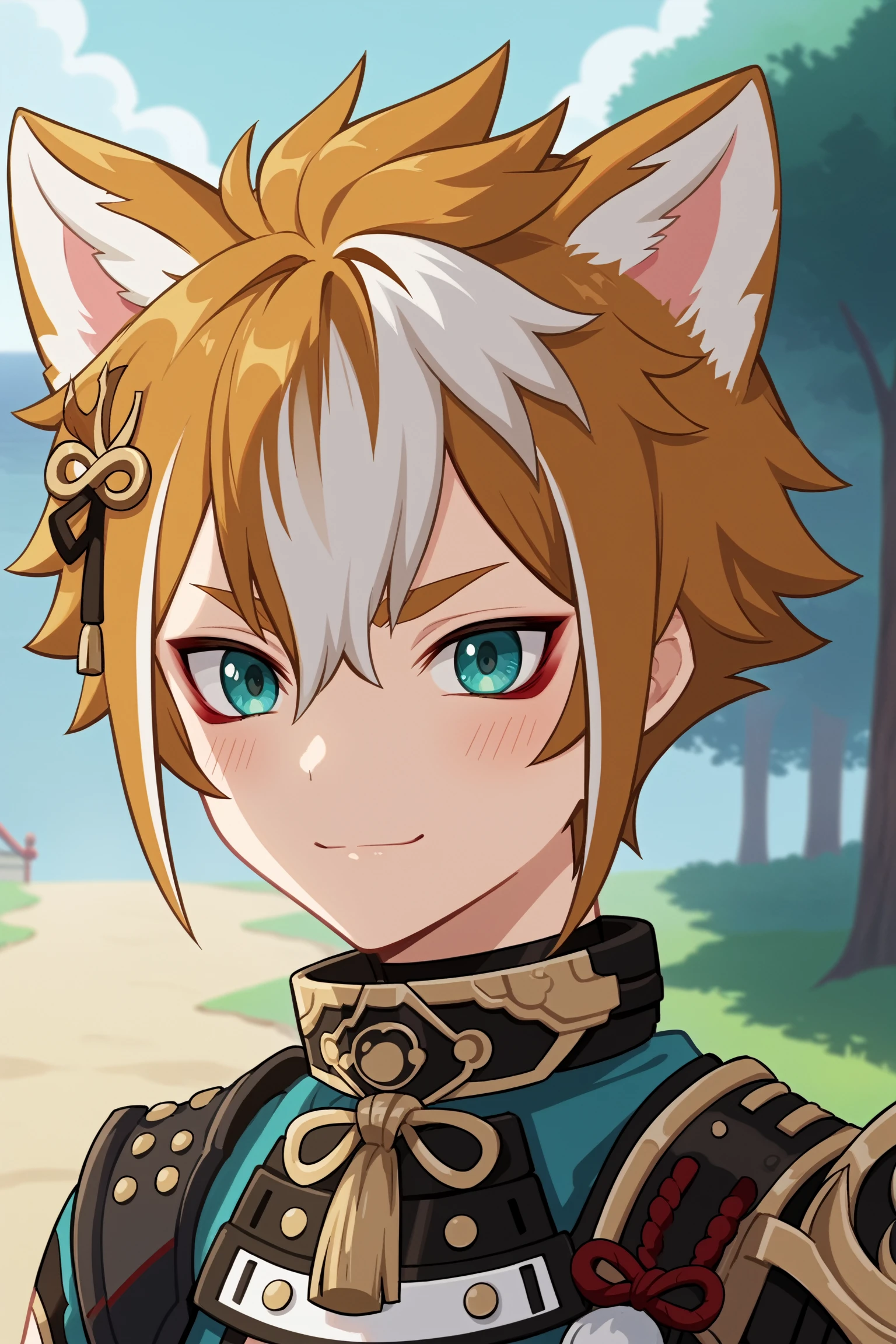 gorou, multicolored hair, orange hair, white hair, teal eyes, red eyeliner, animal ears