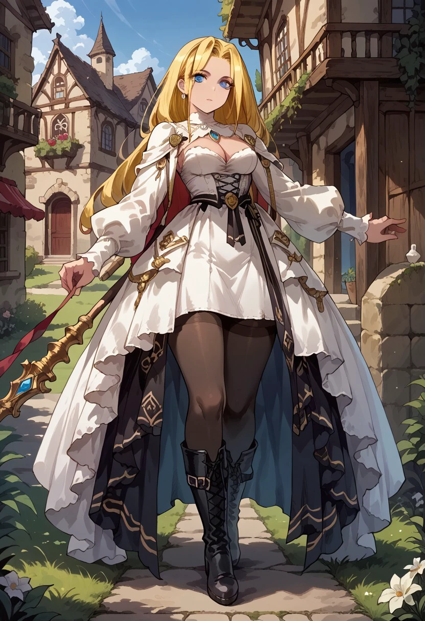 Macherie,1girl,blonde hair,solo,long hair,staff,blue eyes,dress,boots,thighhighs,breasts,black footwear,pantyhose,long sleeves