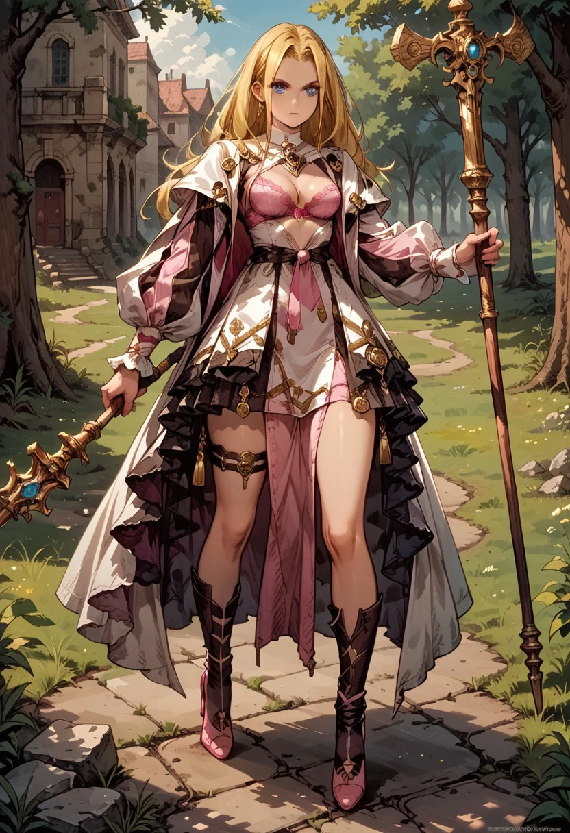 s2macherie,1girl,s2dress,blonde hair,solo,long hair,staff,blue eyes,boots,thighhighs,breasts,black footwear,pantyhose,long sleeves
