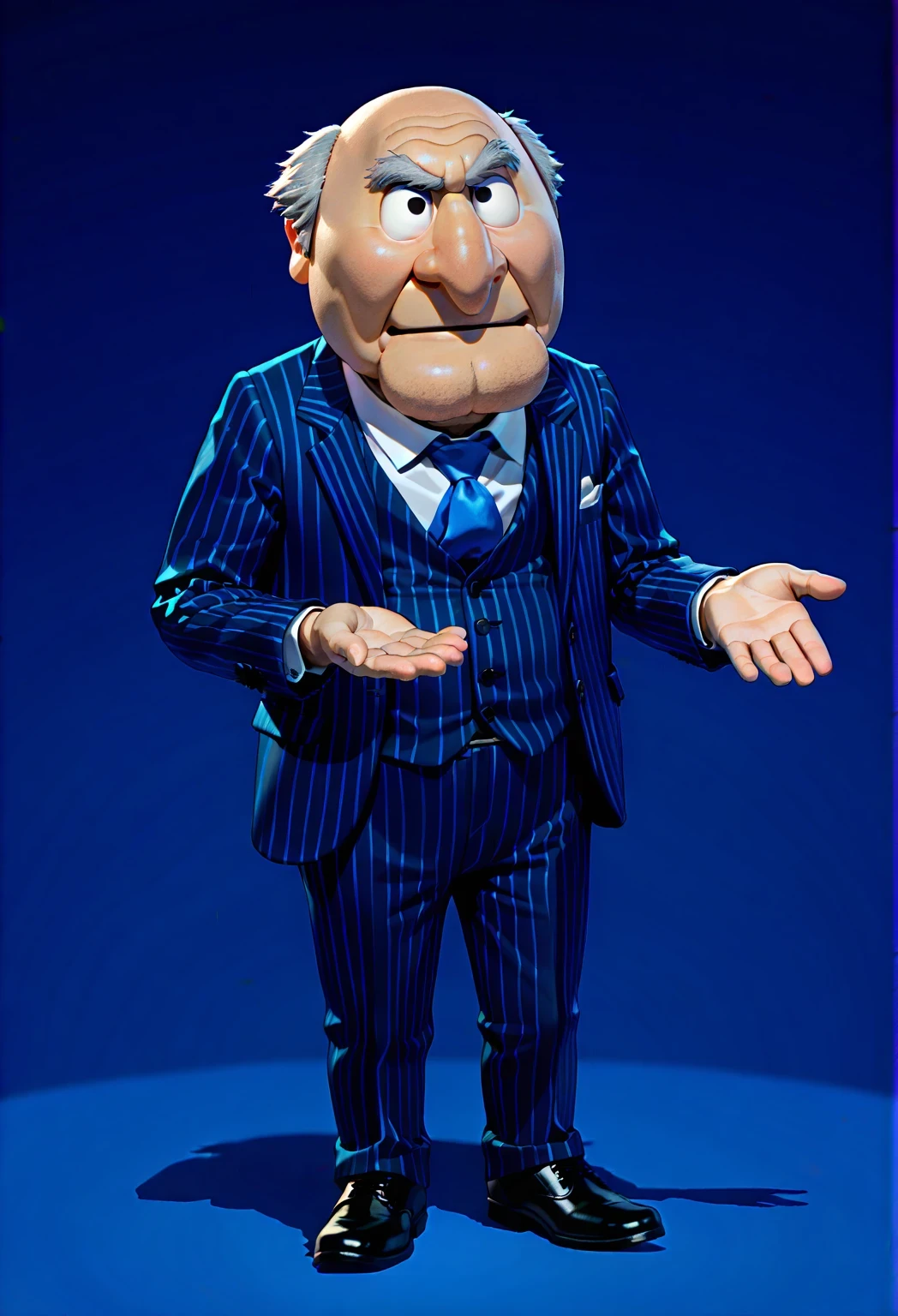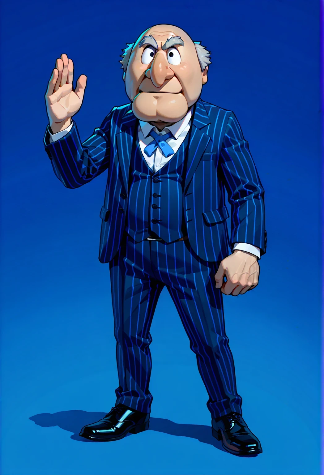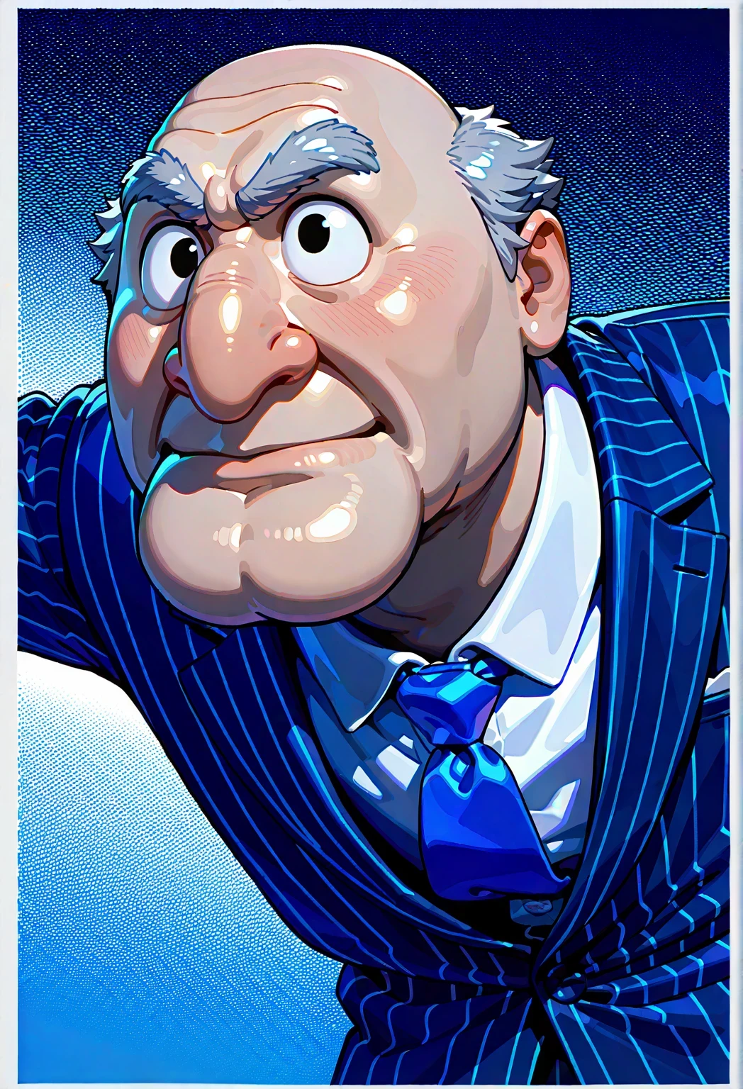 StatlerTM, 1boy, dark pinstripe suit, white shirt, blue neck-tie, large nose, bushy gray unibrow, balding head, tufts of gray hair, black eyes,