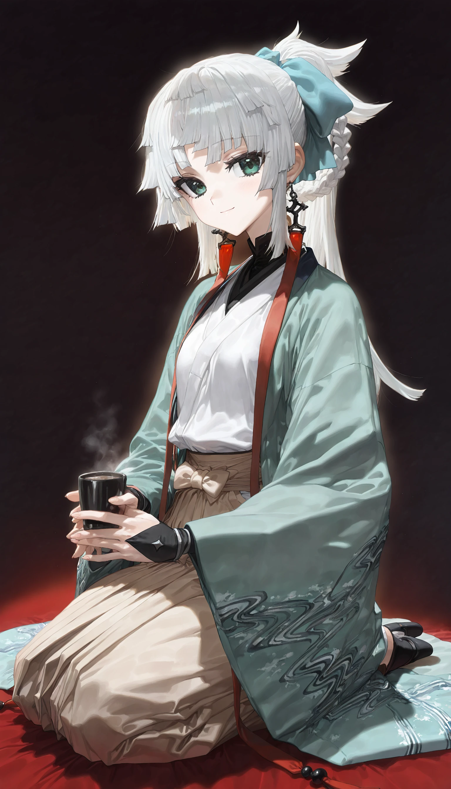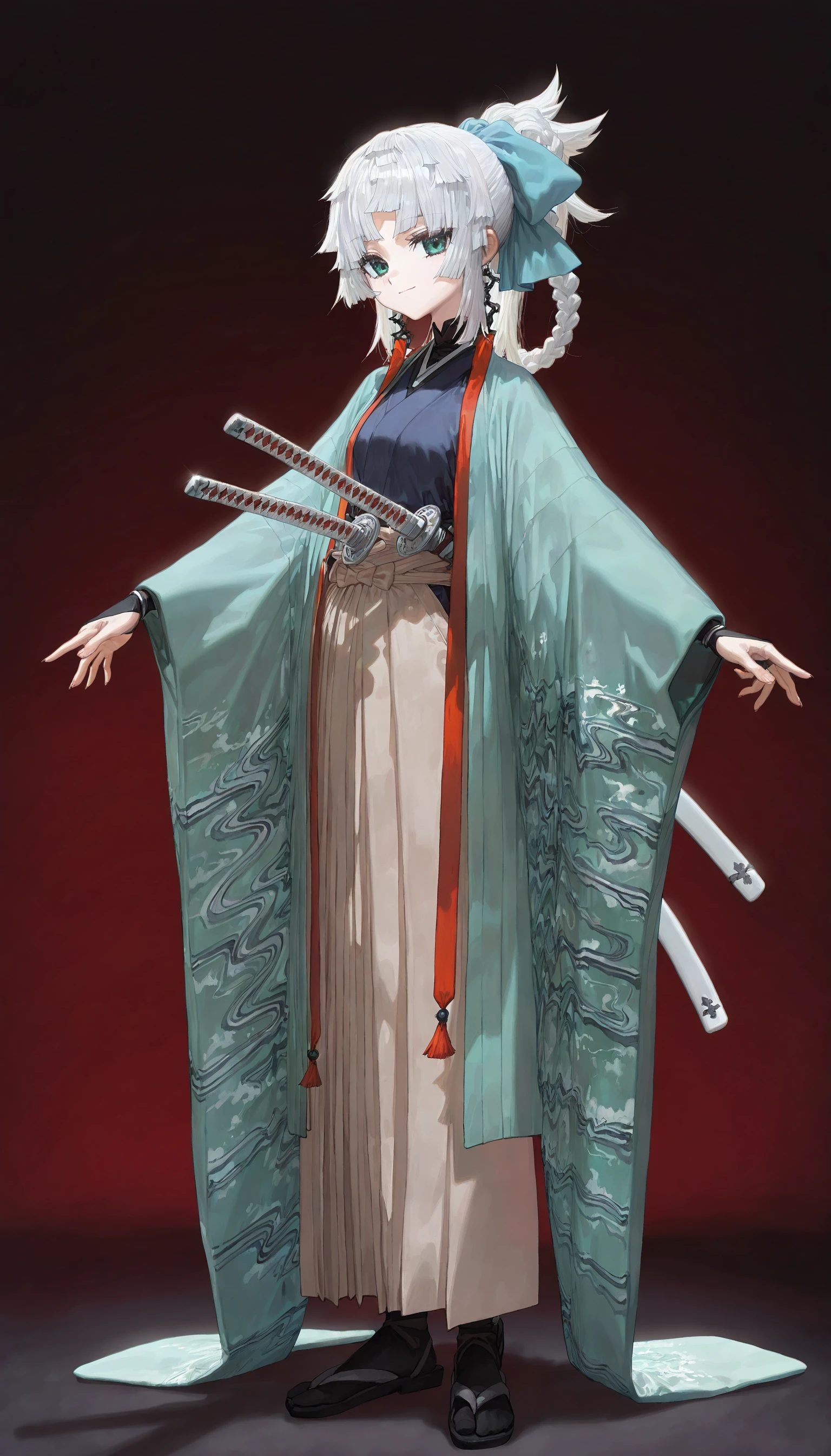 yui_shousetsu_\(second_ascension\)_\(fate\), green eyes ,white hair,ponytail , braided hair rings, hair ribbon, haori , kimono,hakama skirt, bridal gauntlets,sheath,sandals, katana ,
