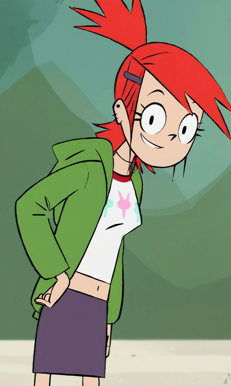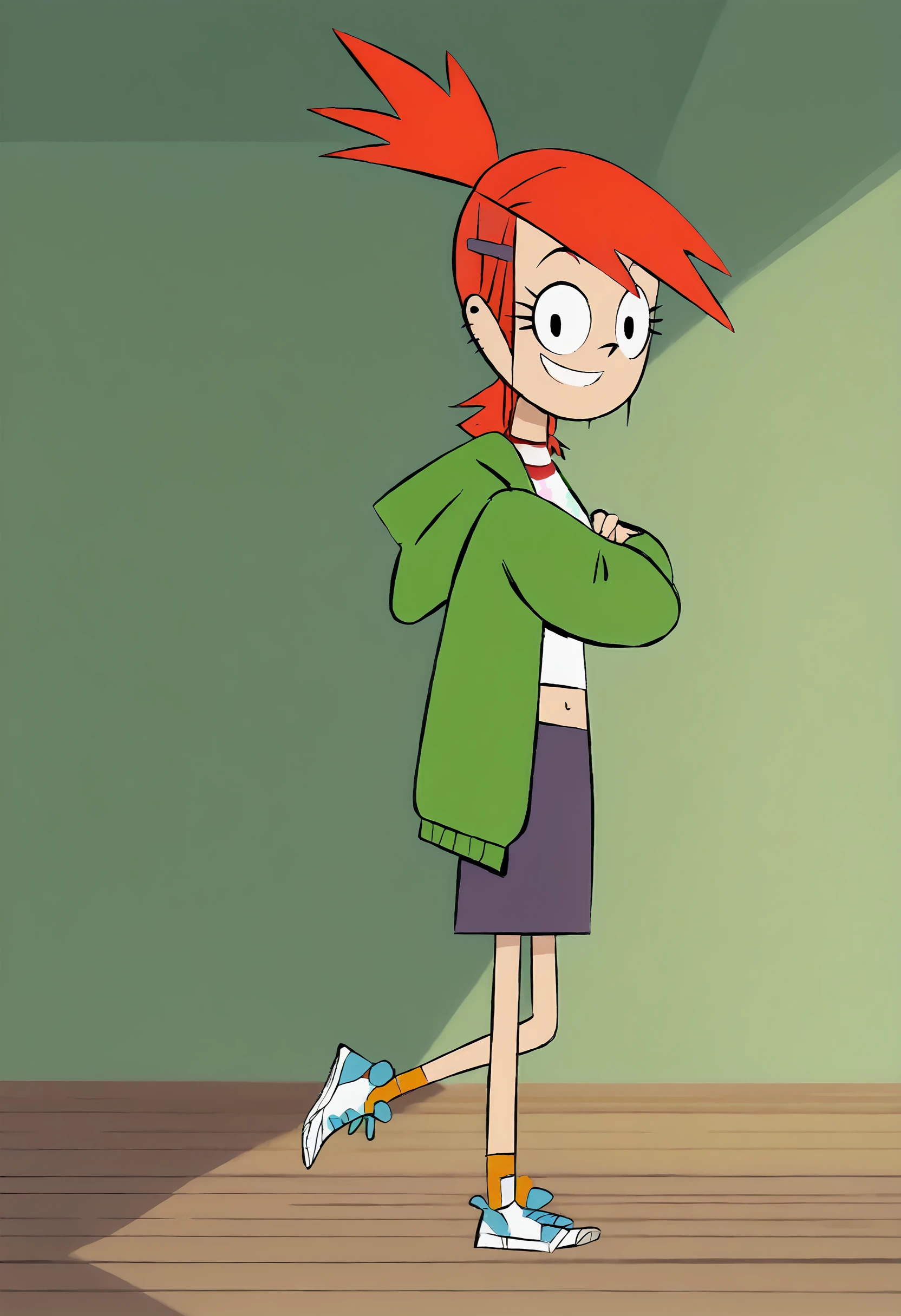 FrankieFoster, 1girl, solo, purple skirt, red hair, smile, navel, hairclip, midriff, sneakers, hood, ponytail, orange socks, earrings, jewelry, green hoodie