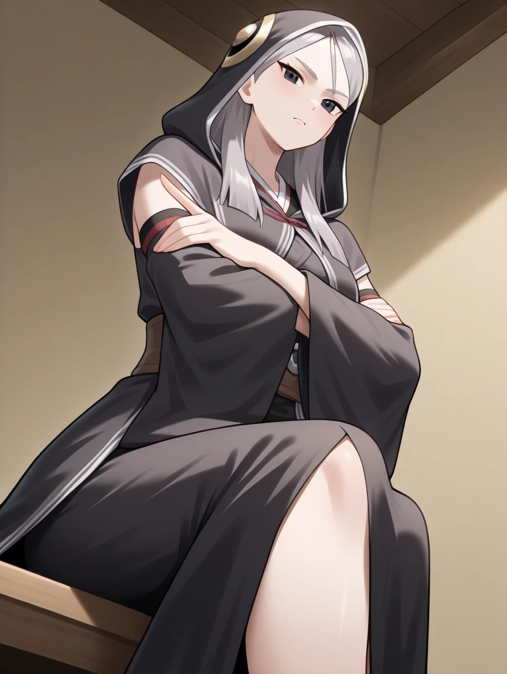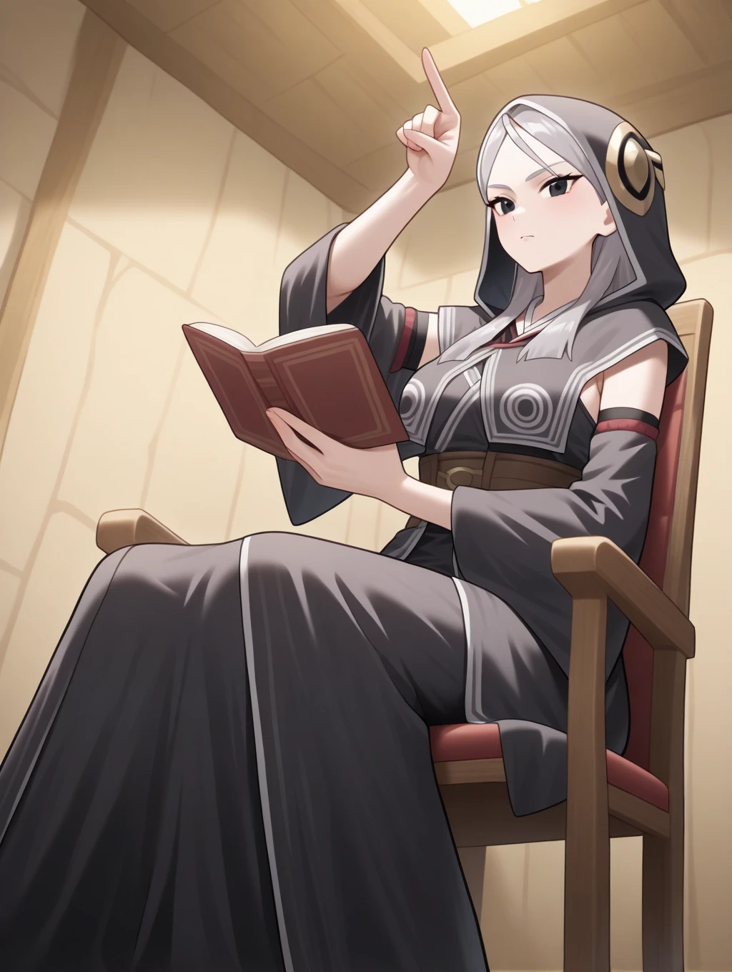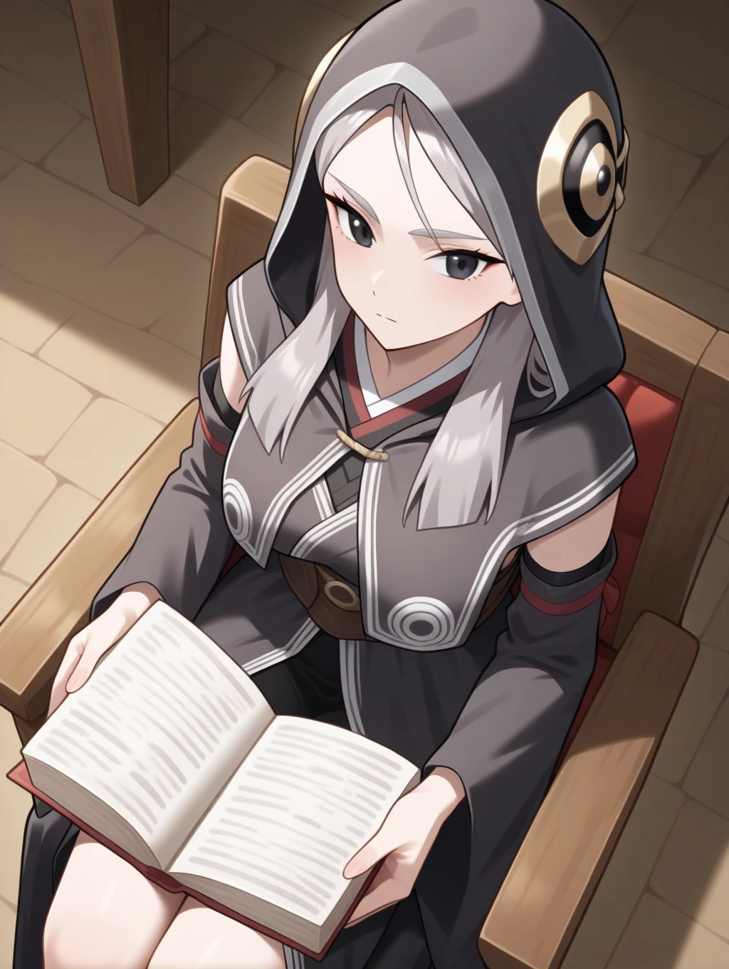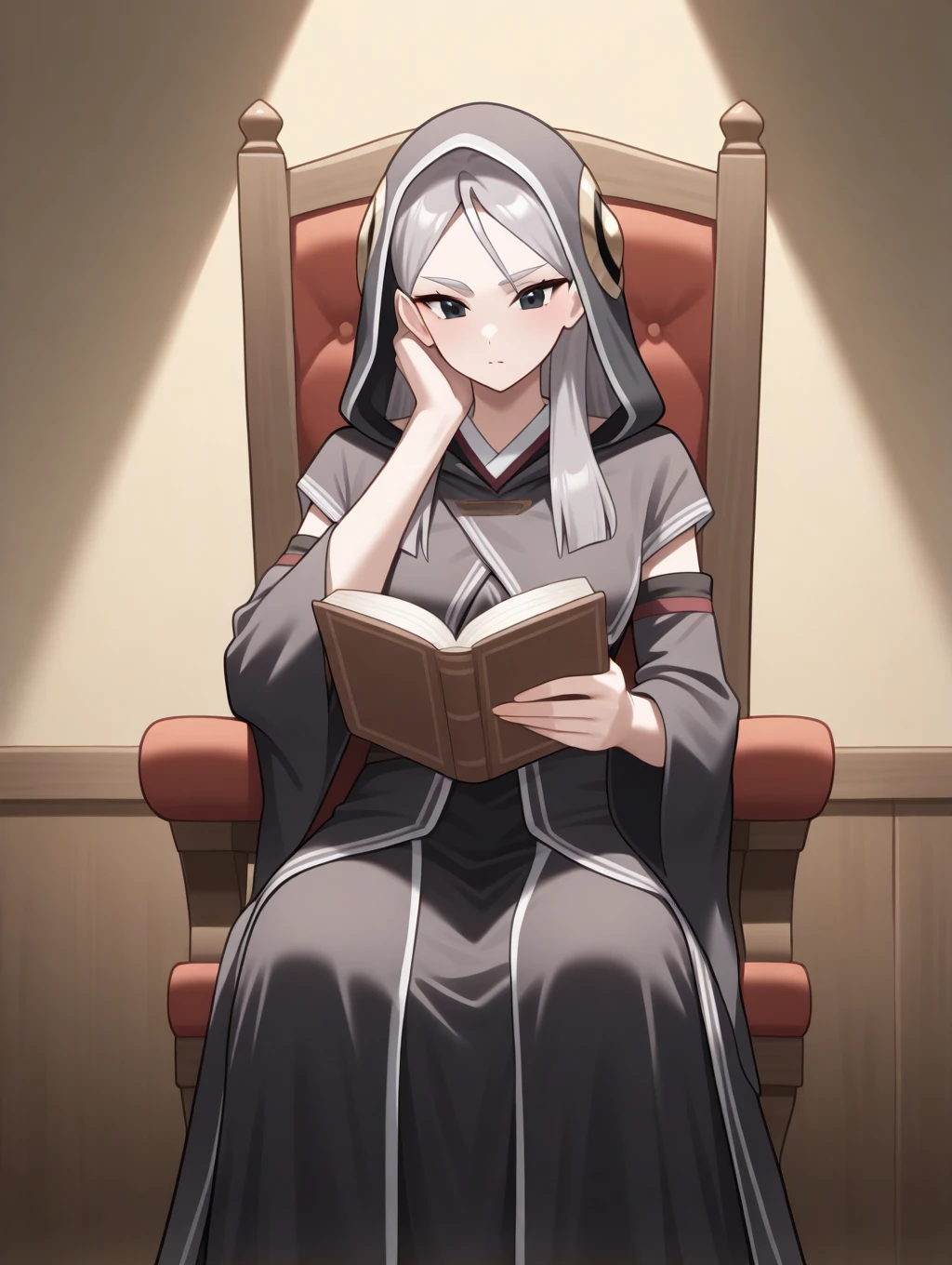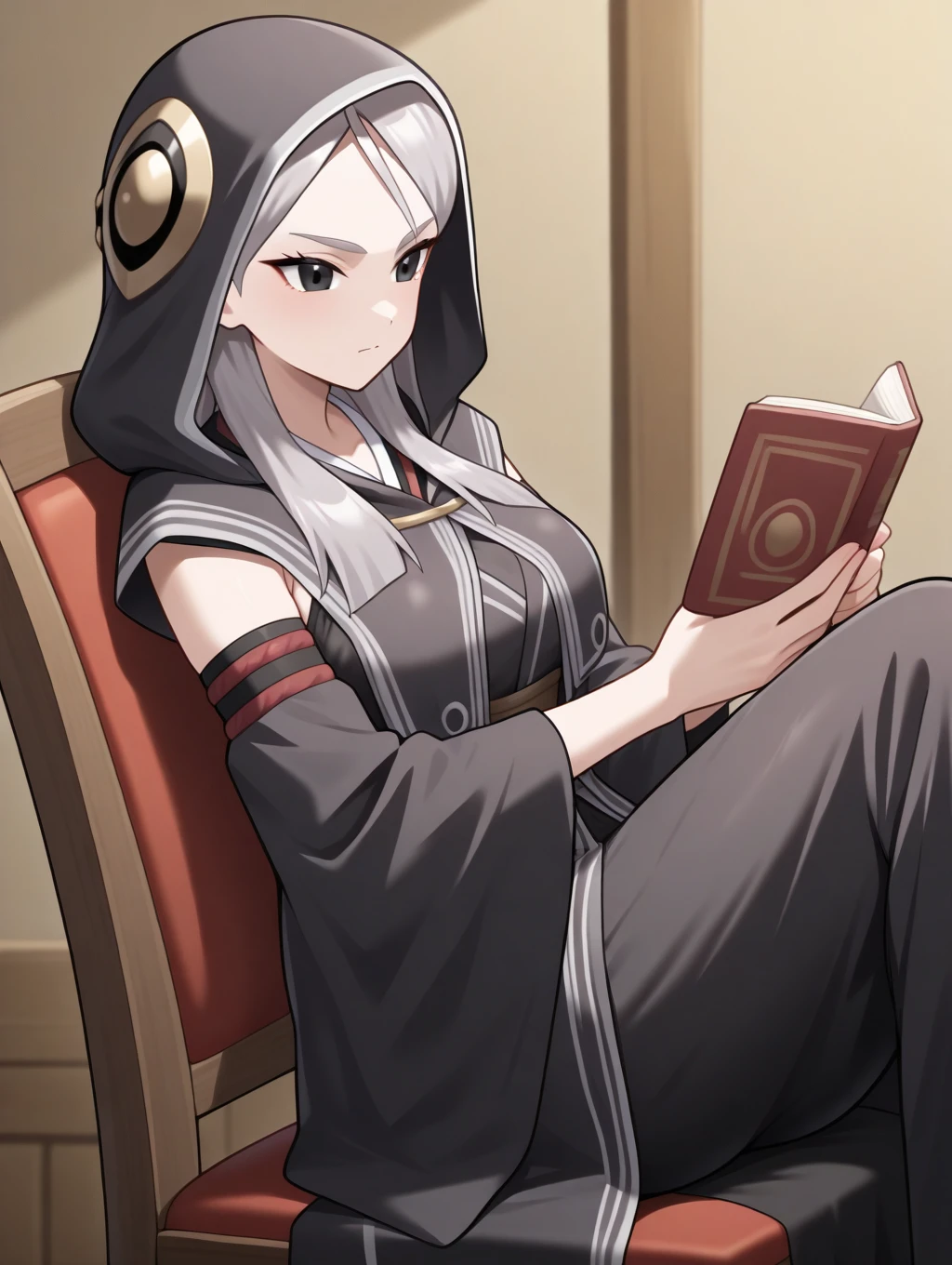 erena,grey hair,black eyes,hood,wide sleeves,arm sleeves,black robe,white lines,sitting,chair,holding book,reading,sole eyes,tareme,gold pattern on hood,light smile,