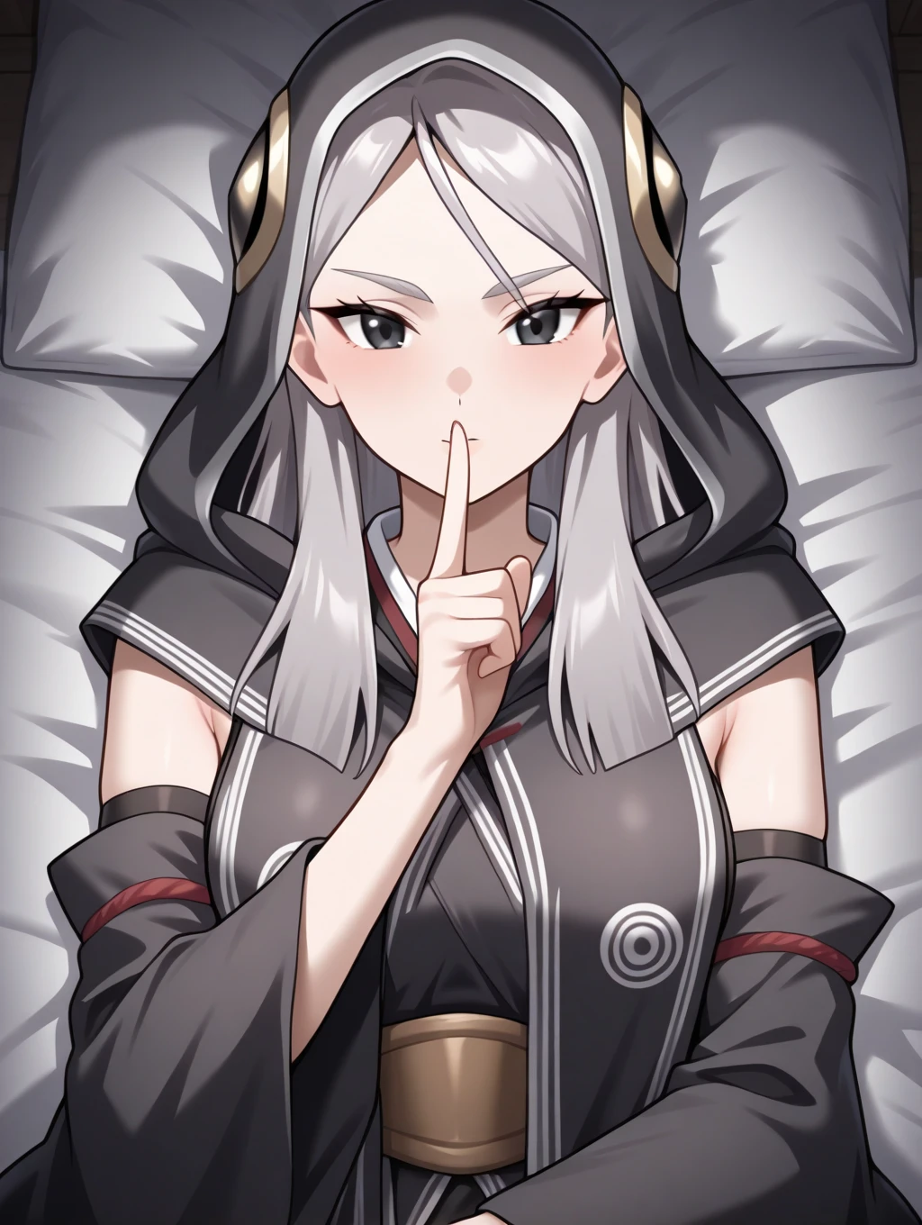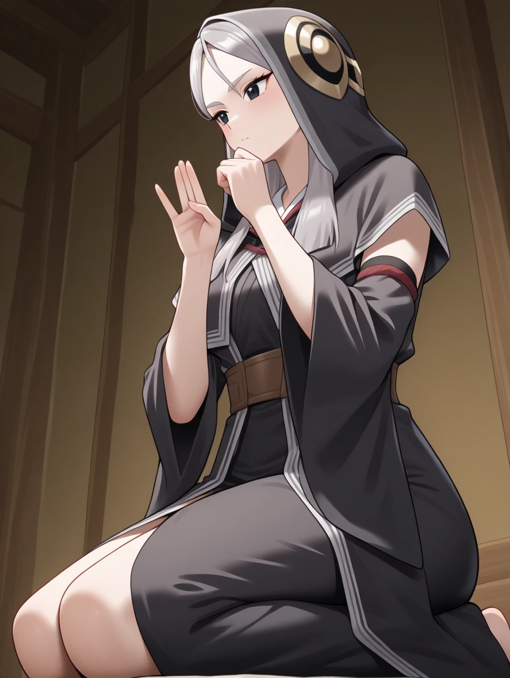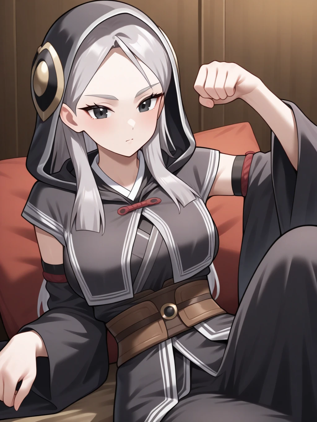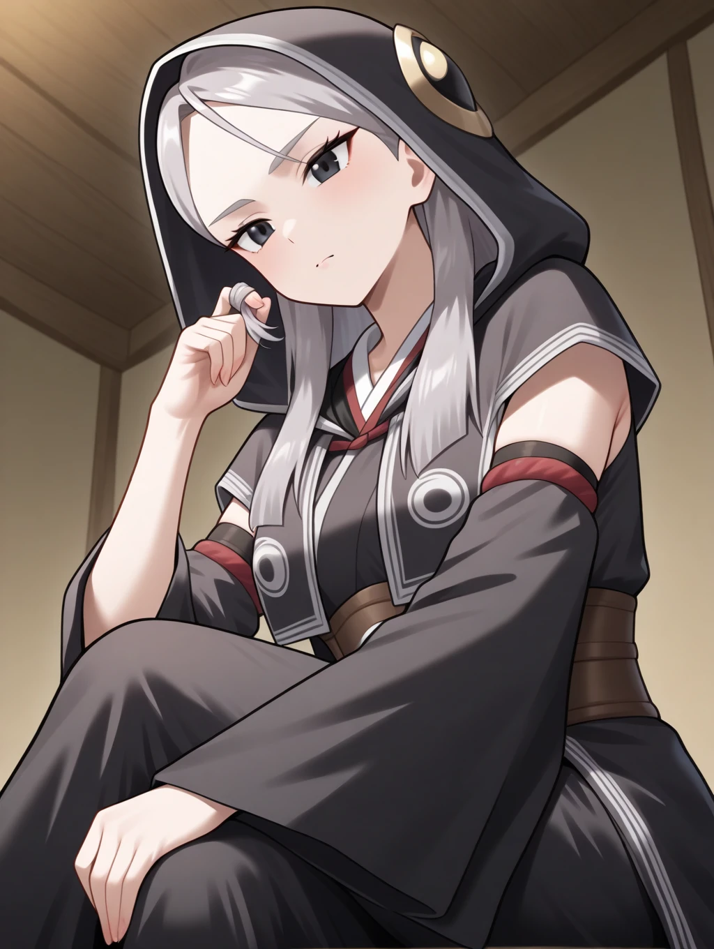 prompt example :erena,grey hair,black eyes,hood,wide sleeves,arm sleeves,black robe,white lines,sitting,chair,holding book,reading,sole eyes,tareme,gold pattern on hood,light smile,