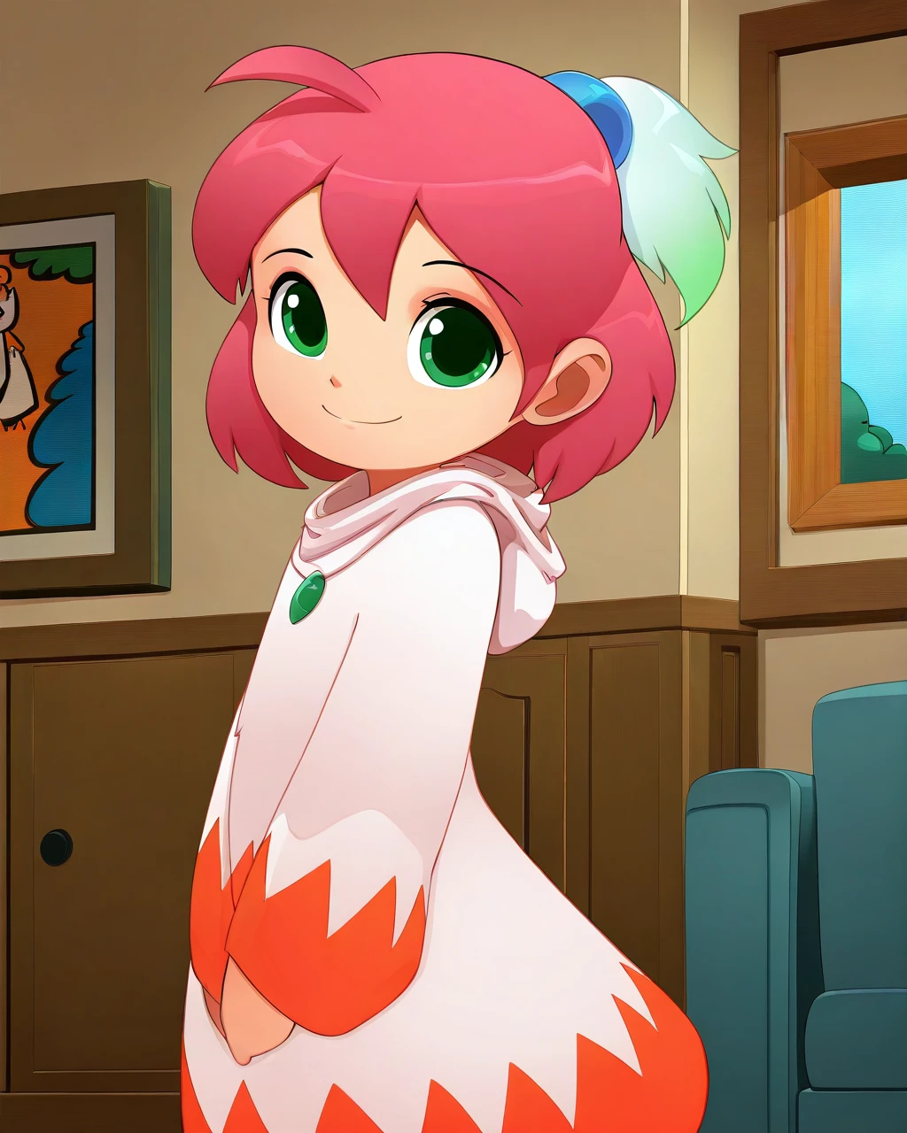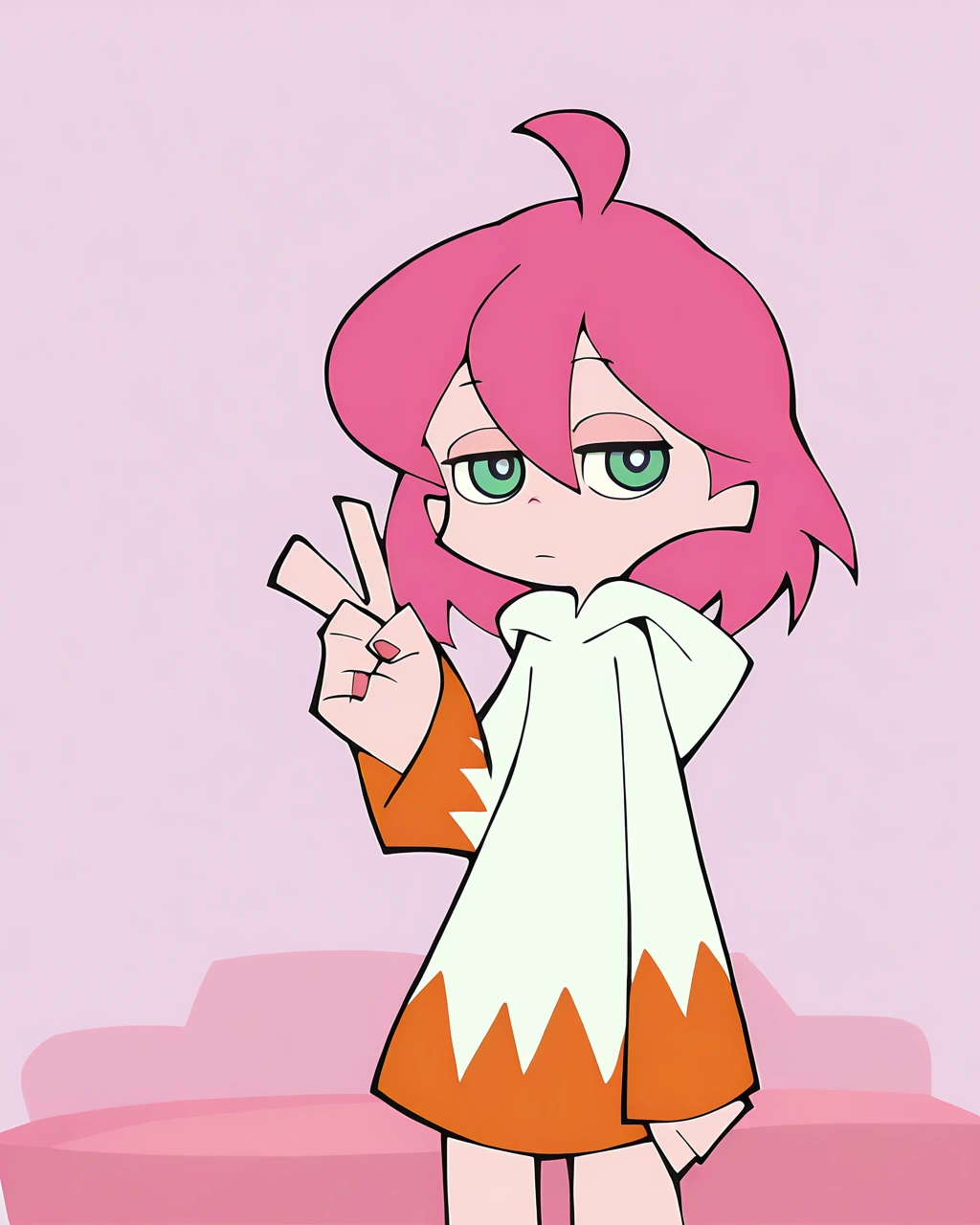 Use green eyes, short hair, pink hair, ahoge, hair ornament to form her apperance.