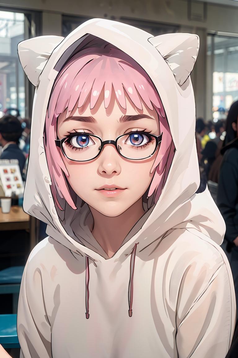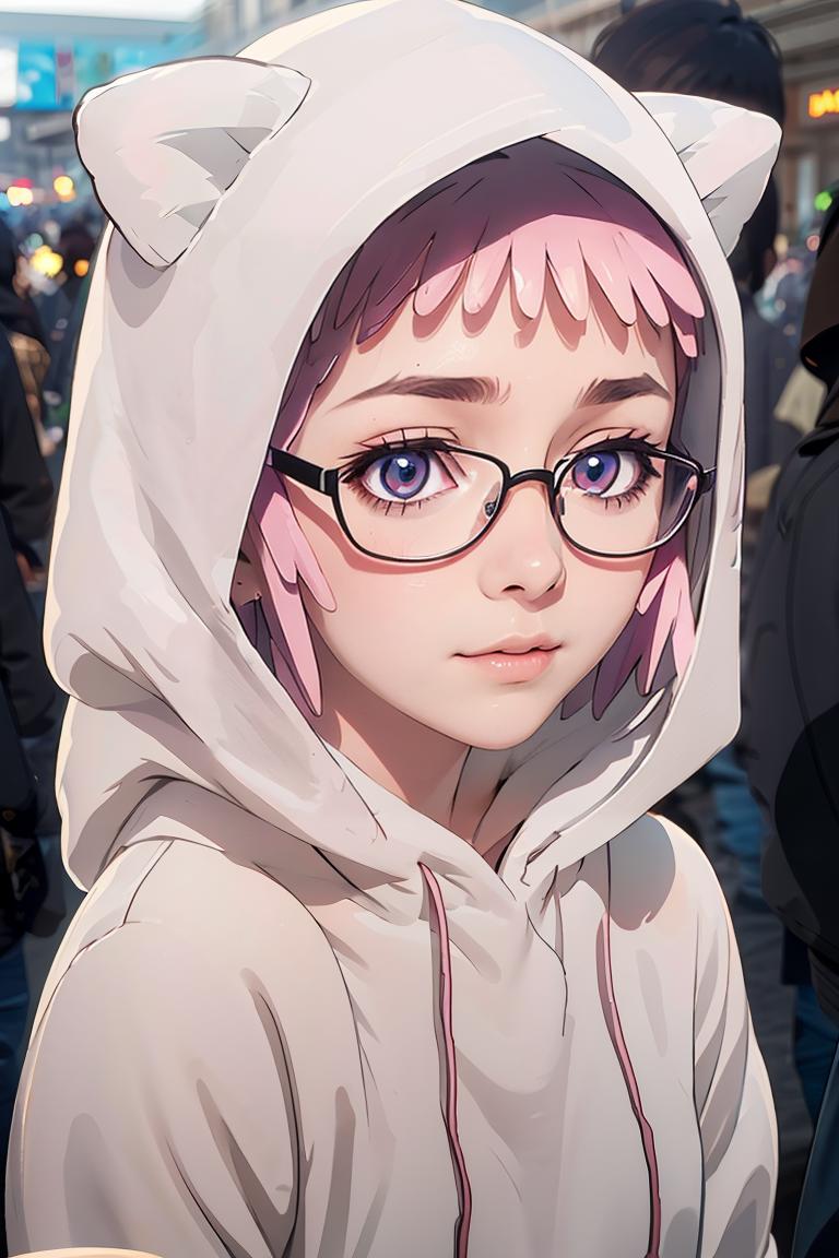 pink hair, purple eyes, short hair, twintailsDescription