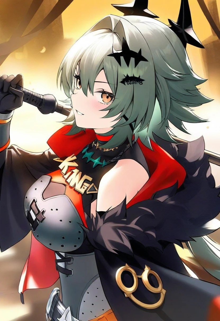 凯撒 caesar king (zenless zone zero),hair ornament,short hair,green hair,horns,fur-trimmed jacket