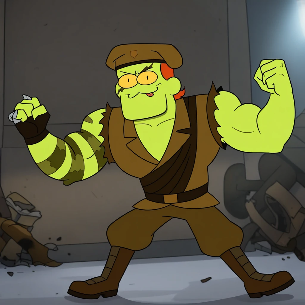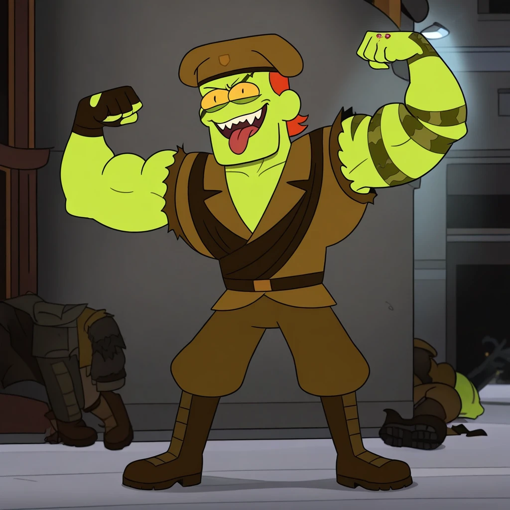 Positive Prompt Guide: Viper Fang, noseless, green skin, face scar, yellow sclera, black eyes, muscular male, arm tattoo, orange hair, beret, sleeveless torn military shirt, military pants, boots, sleeveless glove