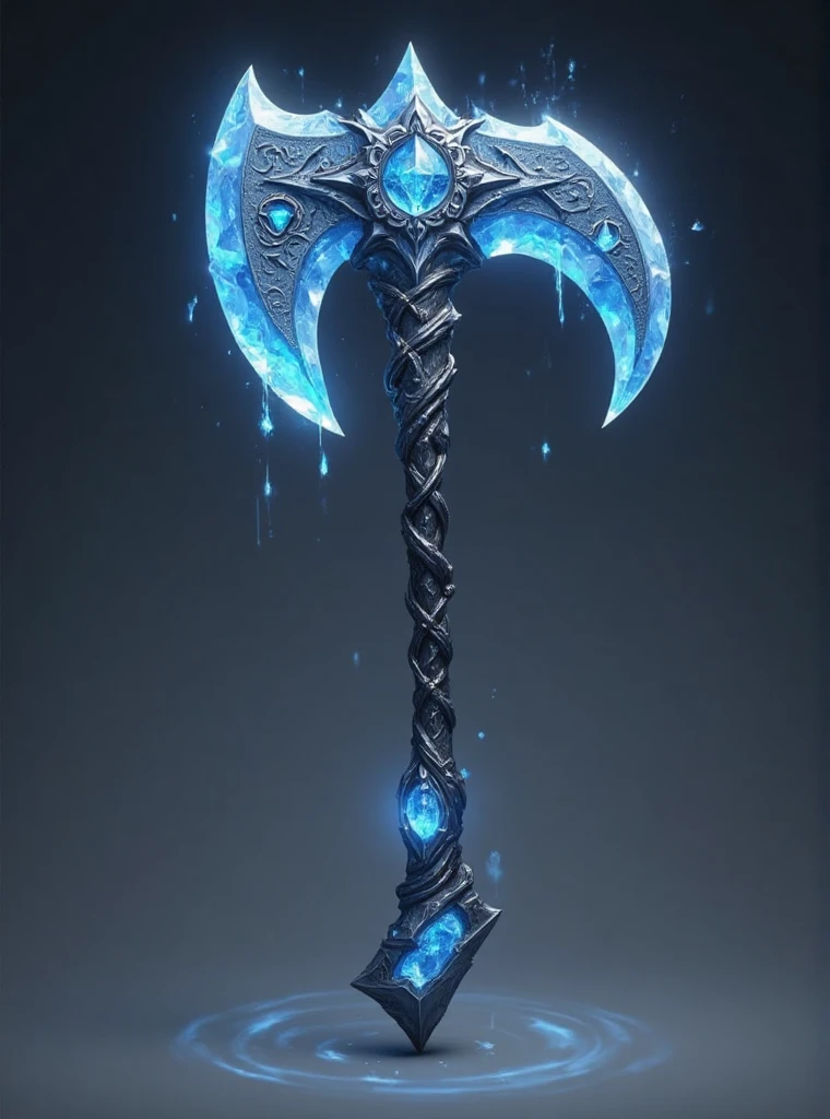 This "Frosty Sky Mountain-Severing Axe" has a blade like condensed glacial ice, radiating a piercing cold light. The axe handle is wrapped with black iron chains, with a crystal ice ball hanging at the end that makes a rustling sound of breaking ice when shaken. Swinging it unleashes a winter storm that freezes enemies in its path. The snow wolf totem carved on the axe head will open its eyes and roar, granting immense strength to the wielder, making it seem capable of splitting mountains and rivers with a single strike.