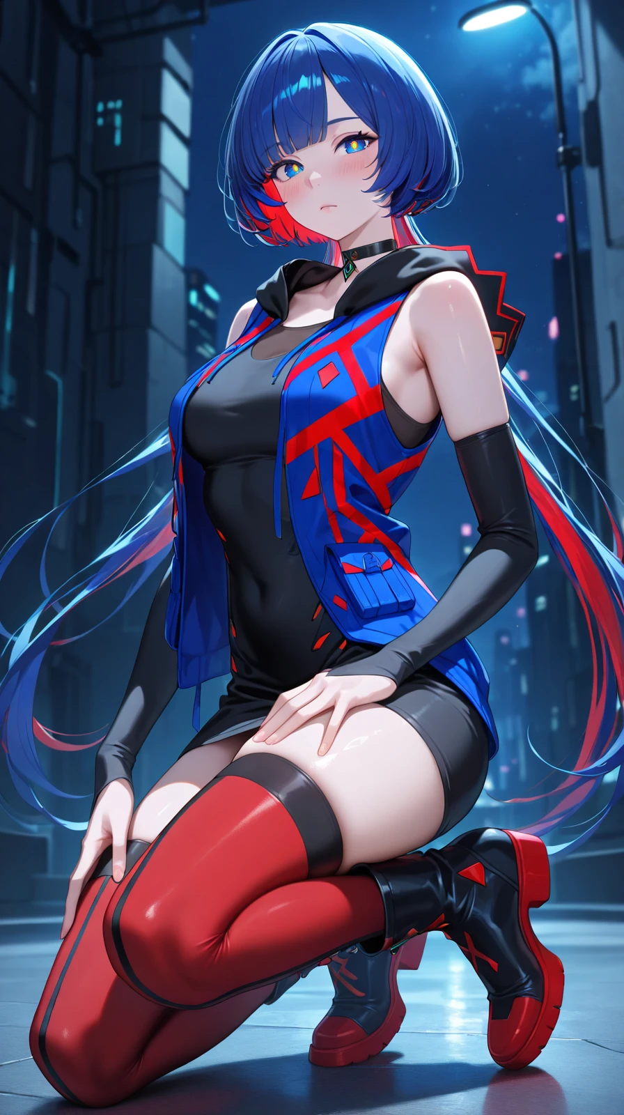 RimDrFuturity, blue hair, blunt bangs, bob cut, long side strands, red hair strands, blue eyes, yellow pupils, hood down, black dress, short dress, sleeveless, hooded vest, black vest, blue accents, red accents, red thighhighs, black sleeves, red boots, heeled boots, choker, patterned hood, detached sleeves,