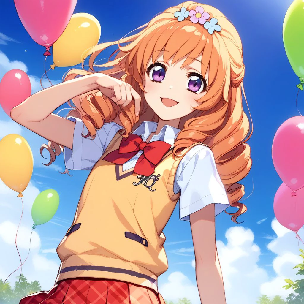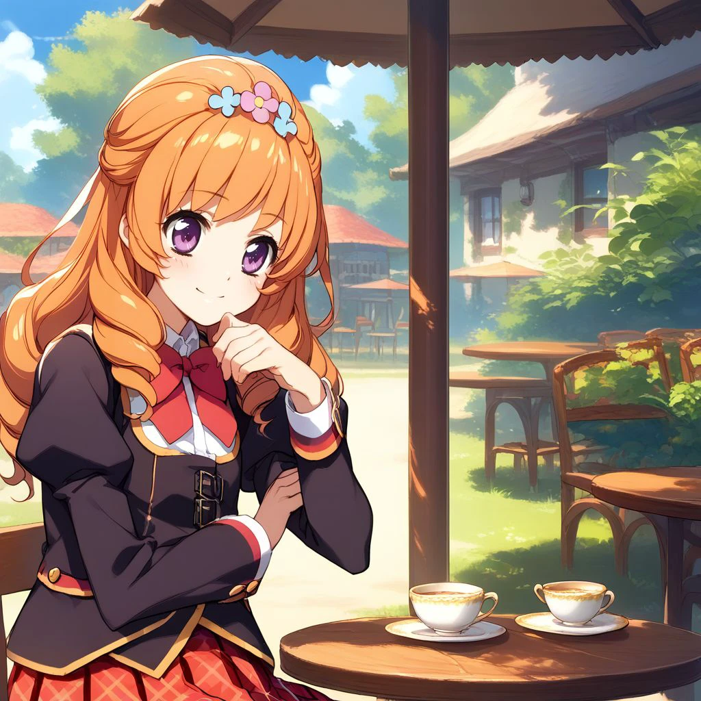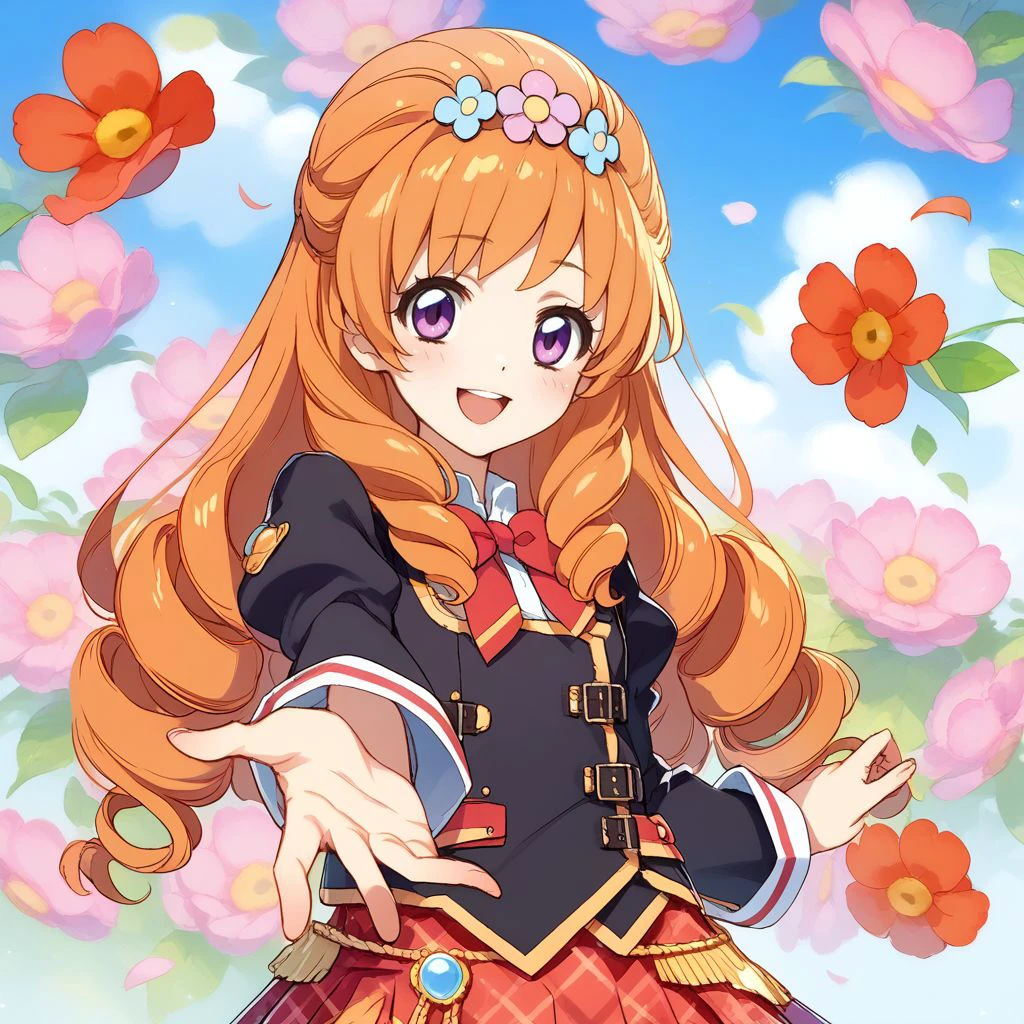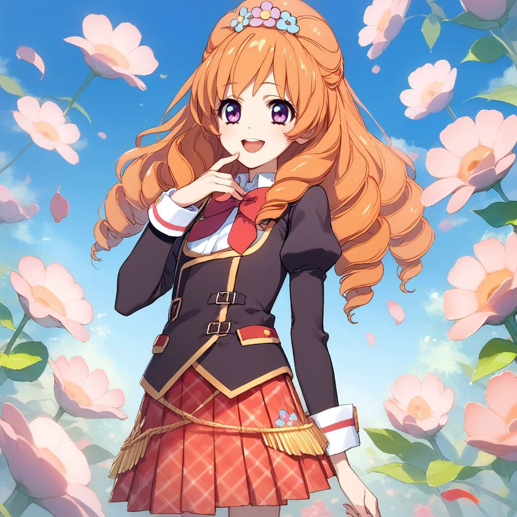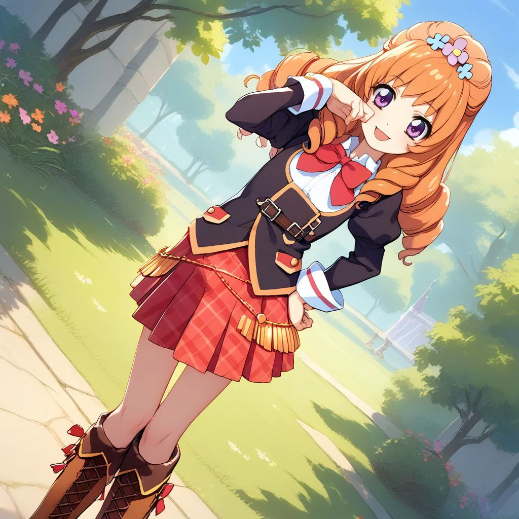 trigger: himesatomaria,purple eyes,orange hair, long hair, drill hair,tiara,hair ornament,hair flower, dreaca school uniform,bowtie,red bow,black jacket,puffy sleeves,long sleeves, belt,skirt, plaid, red skirt, plaid skirt, pleated skirt, boots, brown footwear, knee boots,
