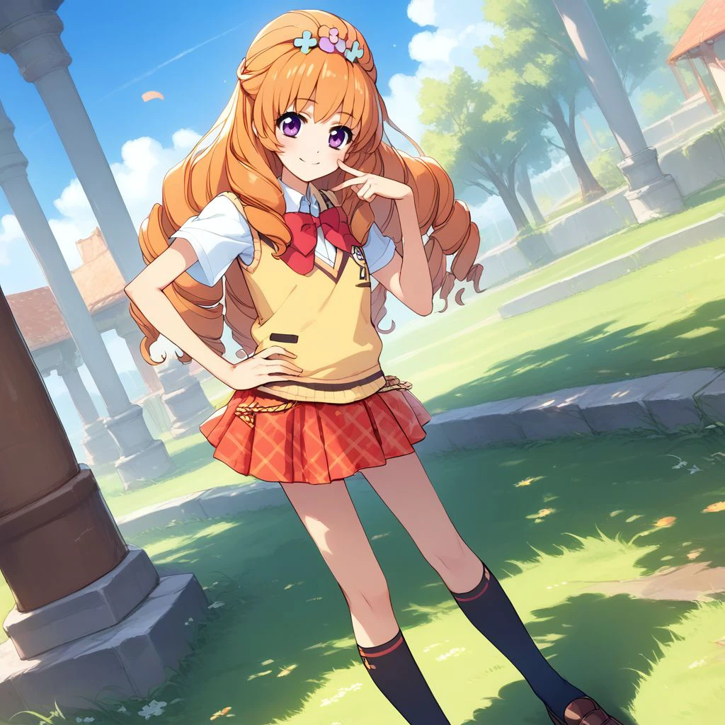 himesatomaria,purple eyes,orange hair, long hair, drill hair,tiara,hair ornament,hair flower, dreaca school uniform,bowtie,red bow,black jacket,puffy sleeves,long sleeves, belt,skirt, plaid, red skirt, plaid skirt, pleated skirt, boots, brown footwear, knee boots, acaerd summer uniform,yellow vest, sweater vest, ,red bow, plaid skirt, black socks,loafers,