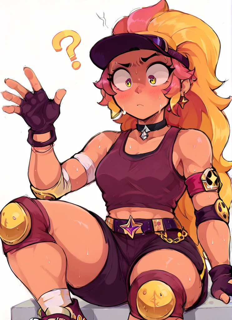 boamber ,1 girl , multicolored hair, long hair ,purple tank top, belt, yellow knee pads, shorts , skirt, shorts under skirt, visor cap, pink headwear, fingerless gloves,white Arm band,