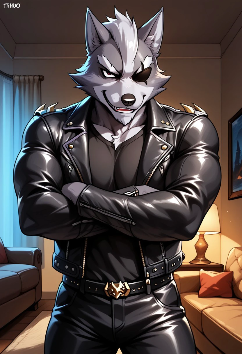 Wolf O’Donnell, broad shoulders, mature male, red eyes, athletic build, animal ears, wolf, scruffy, anthro, anthro male, gray fur, eyepatch on left eye