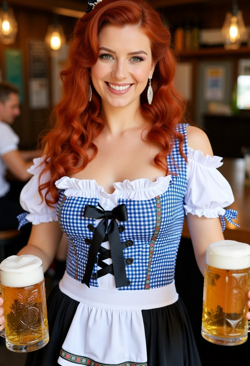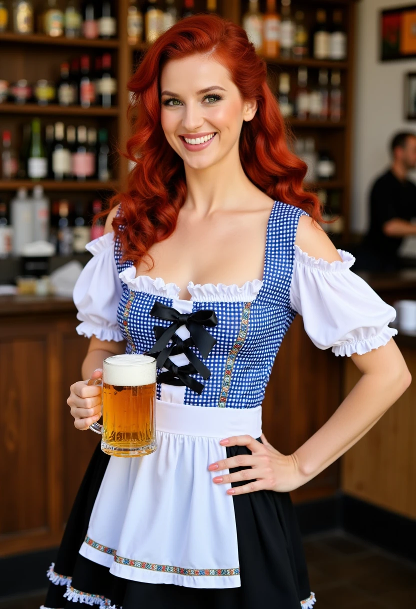 dressed in a traditional Bavarian-style dirndl, a traditional German dress. The dirndl is a festive, colorful outfit with a blue and white gingham pattern on the bodice, featuring a black ribbon with a bow at the center. The bodice is fitted and has short, puffed sleeves with ruffles at the shoulders. The neckline is low and square-cut