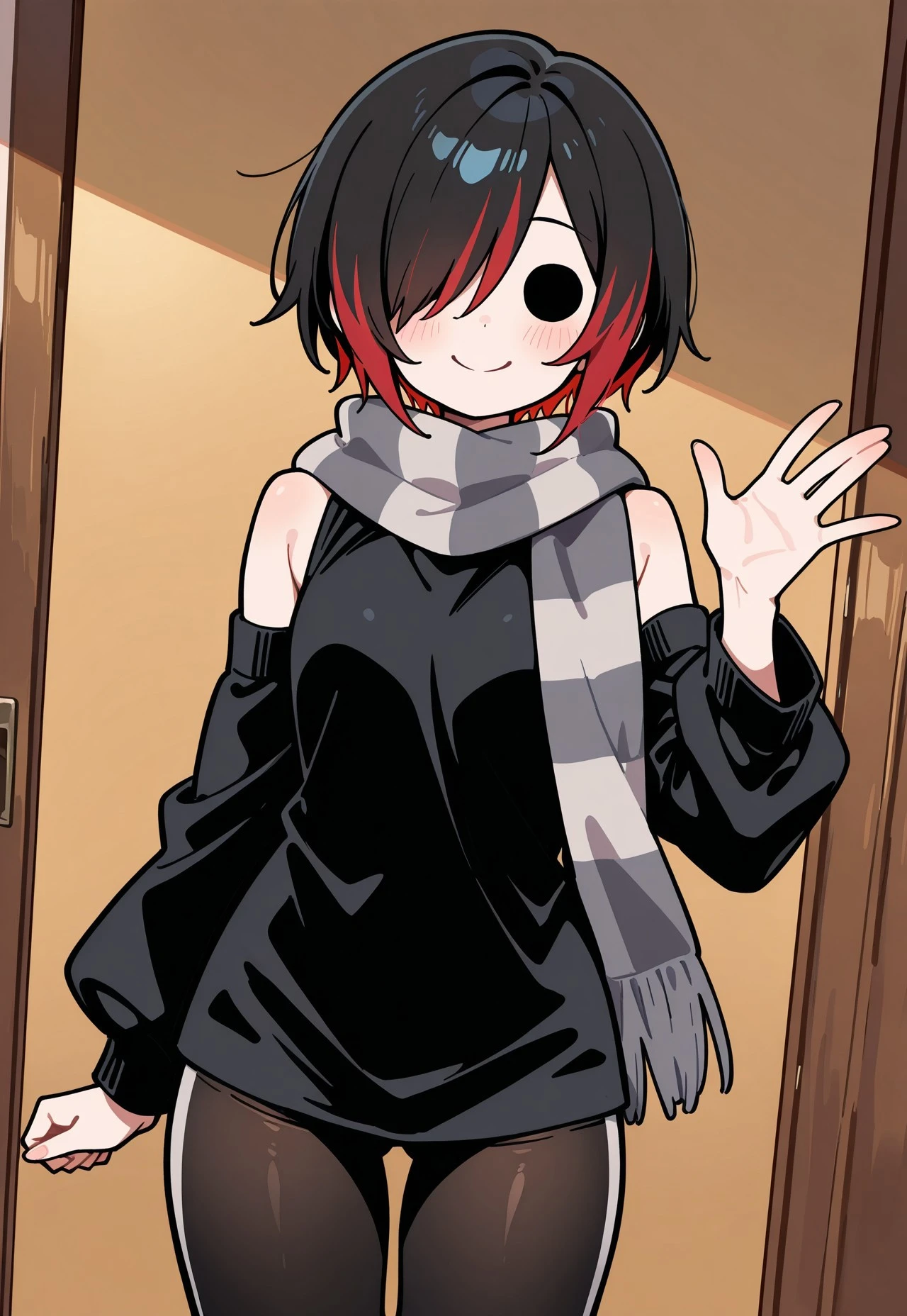 ‘black shirt, bare shoulders, striped scarf, grey scarf, black leggings, leggings, detached sleeves,’