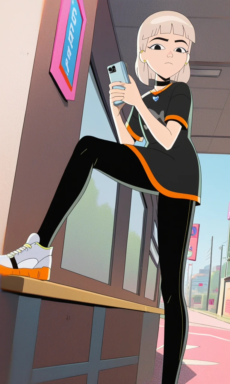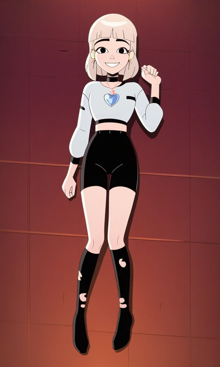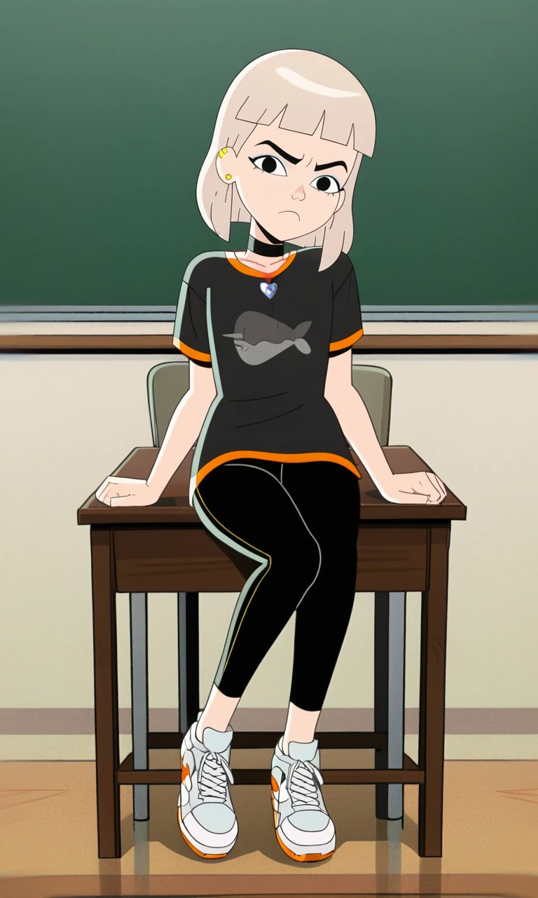 main outfit: black shirt, graphic shirt, black leggings, heart necklace, choker, white sneakers