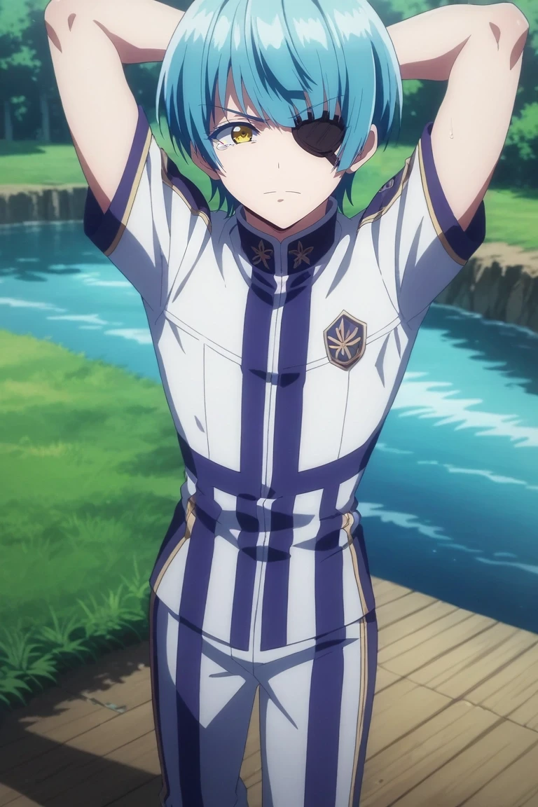 yuuto_ijika, blue hair, yellow eyes, short hair, eyepatch, bangs
