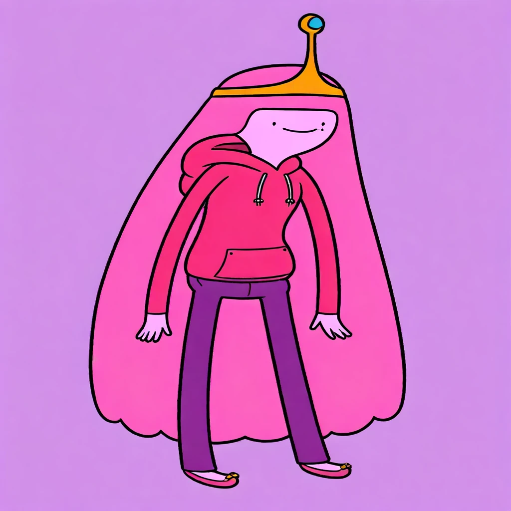 Pink hoodie blue sweatpants red boots red open vest fair skin pink long hair golden tiara