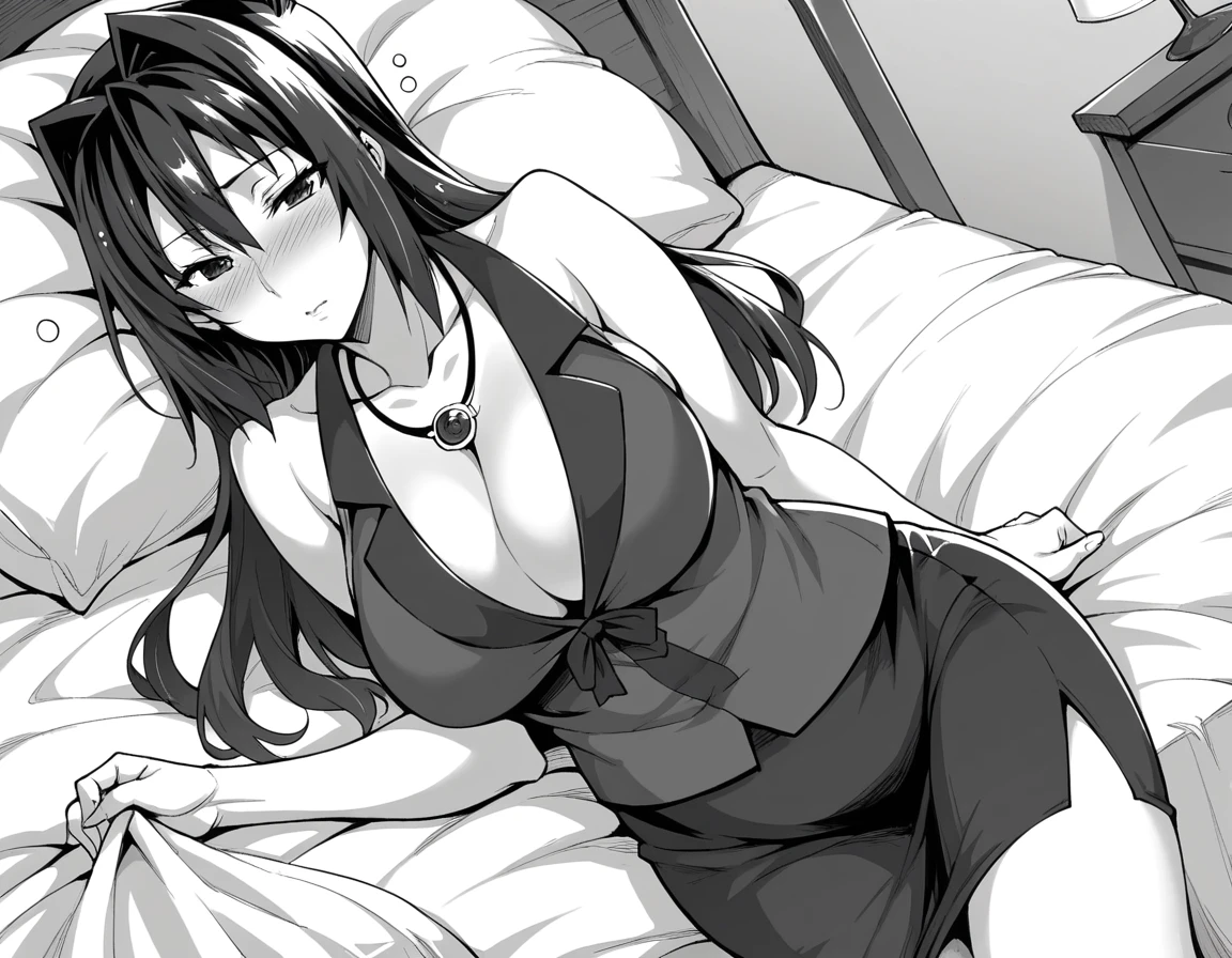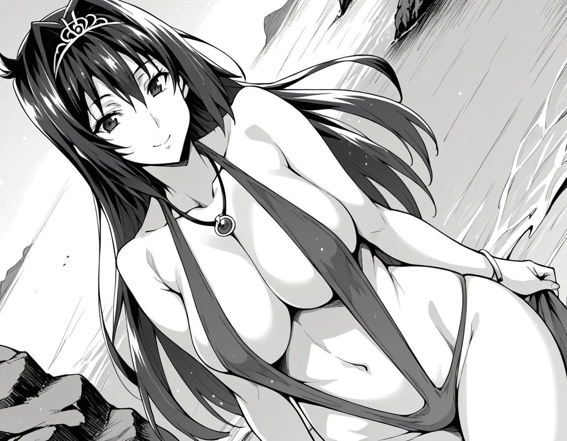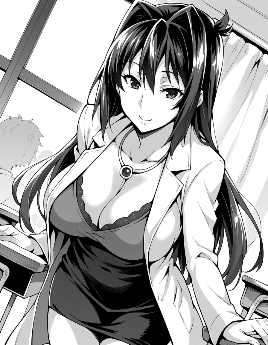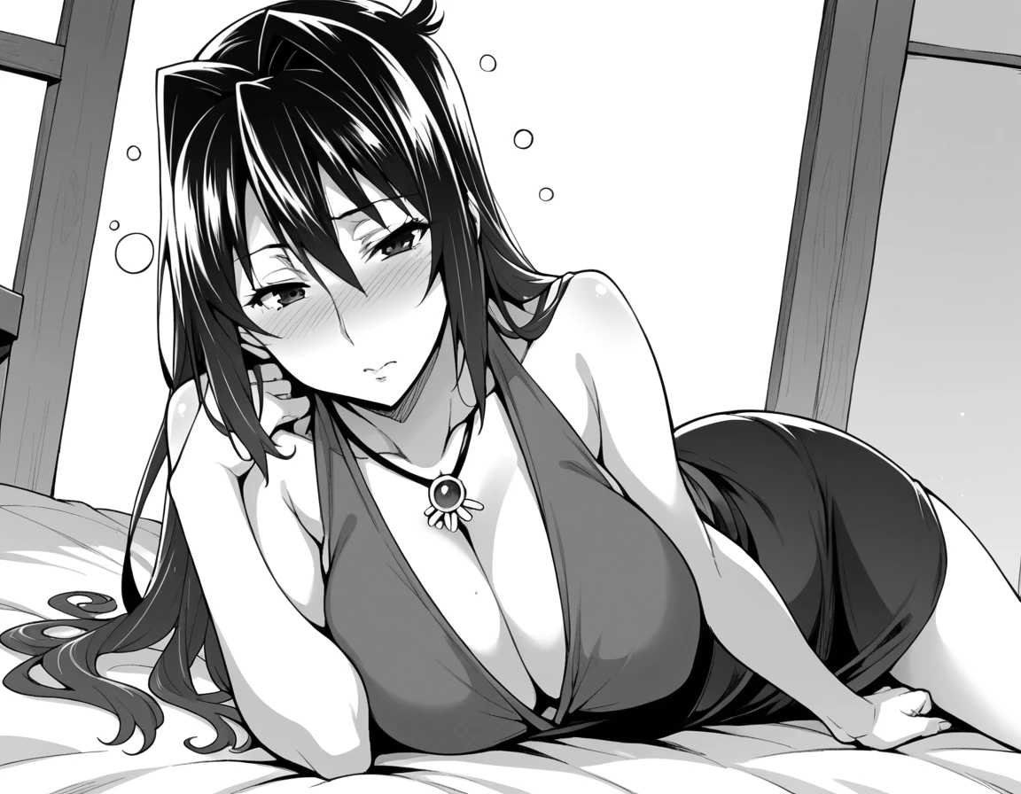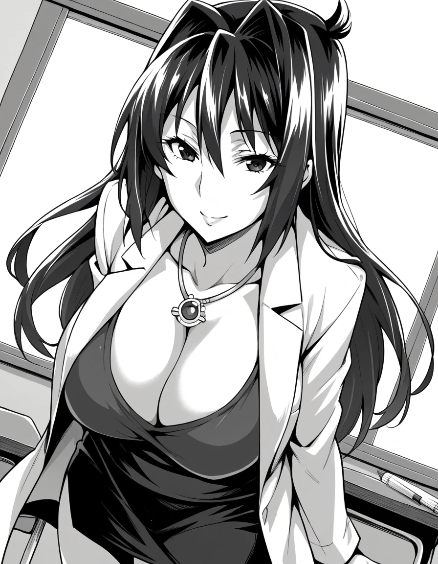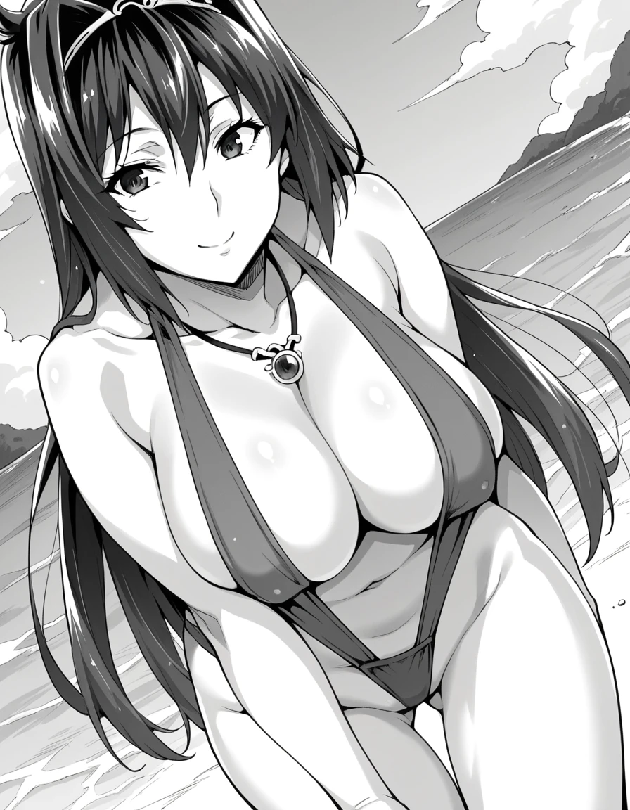 aki nijou, long hair, large breasts, monochrome, greyscale, hair intakes,