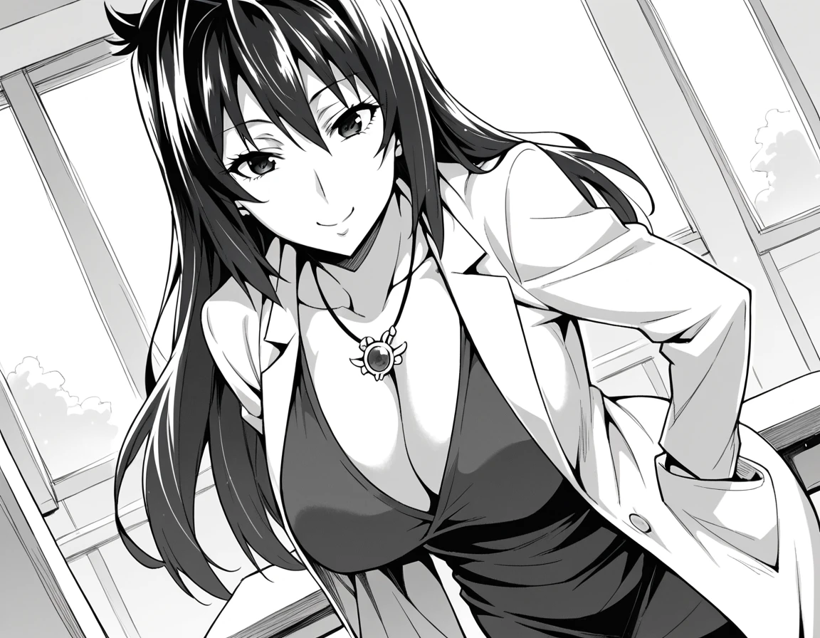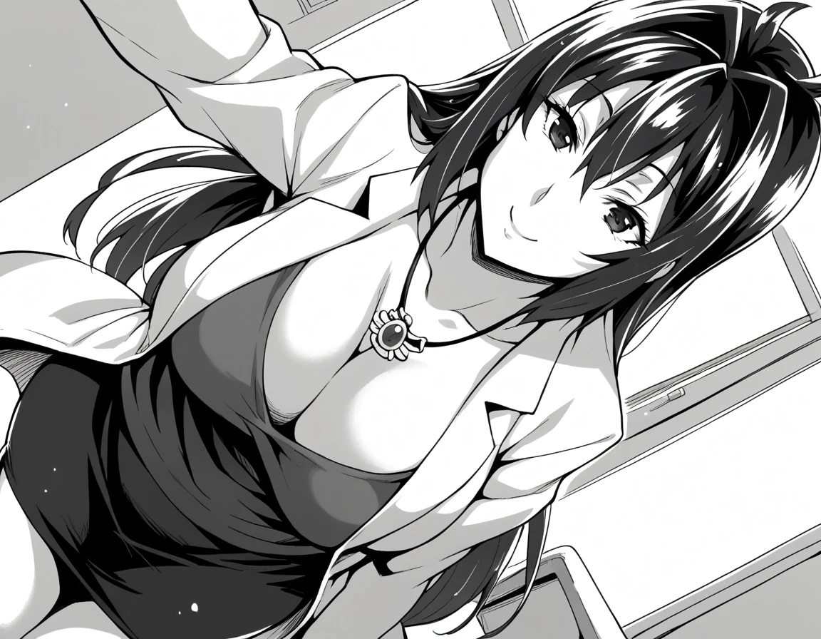 dress, cleavage, necklace, pencil skirt, labcoat,
