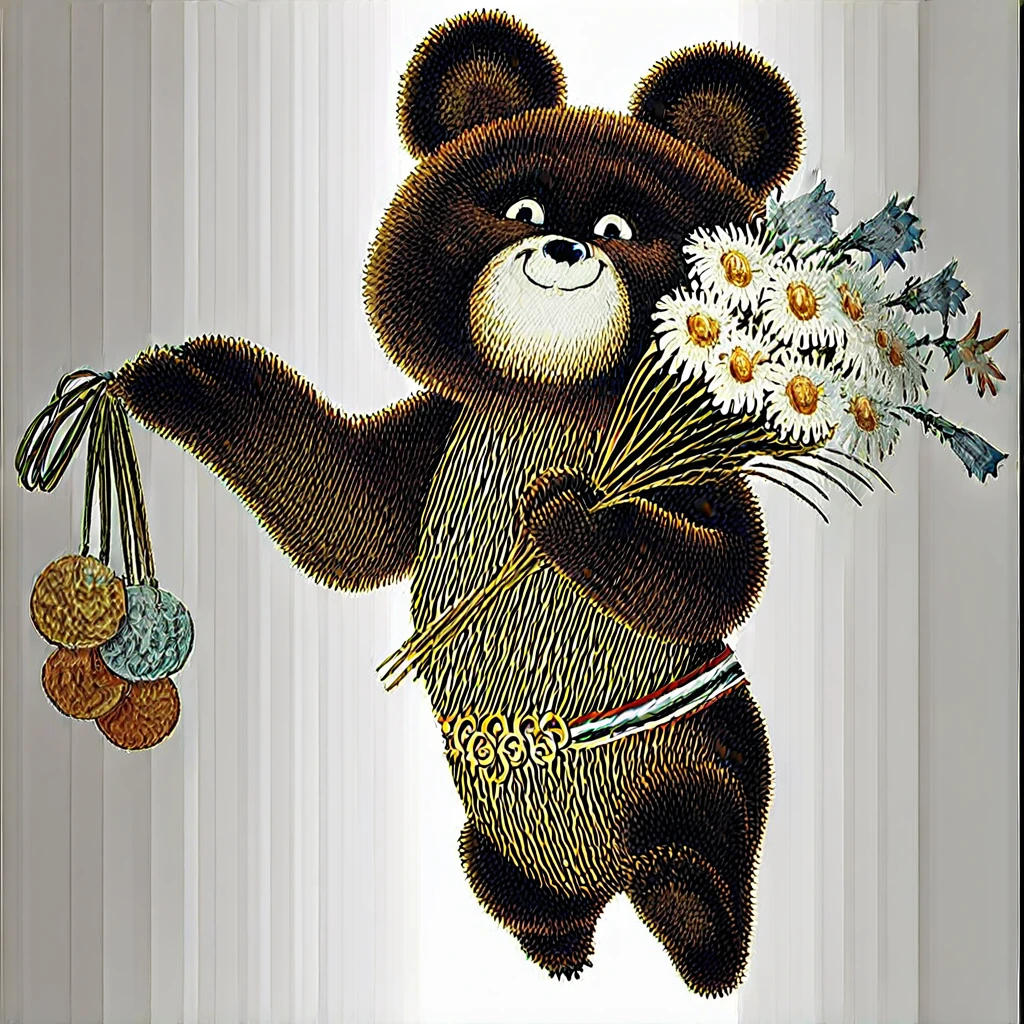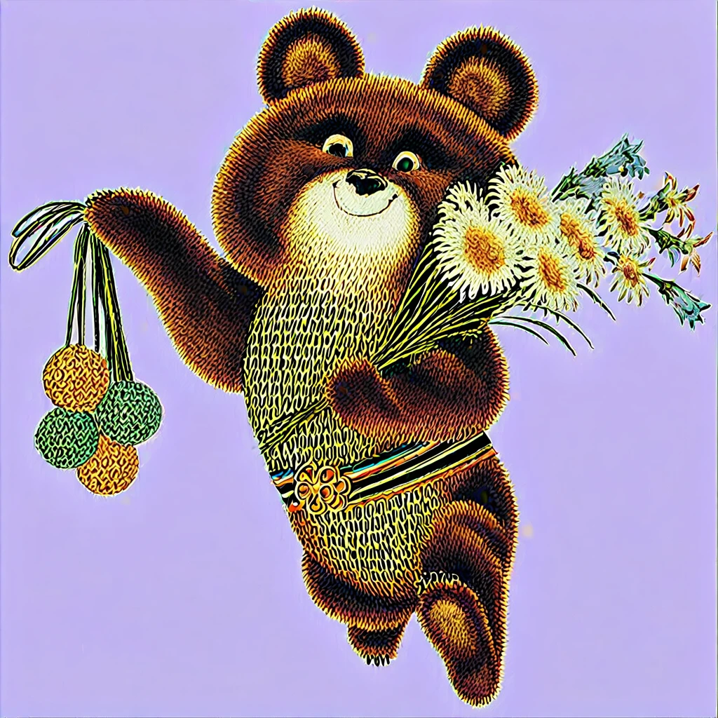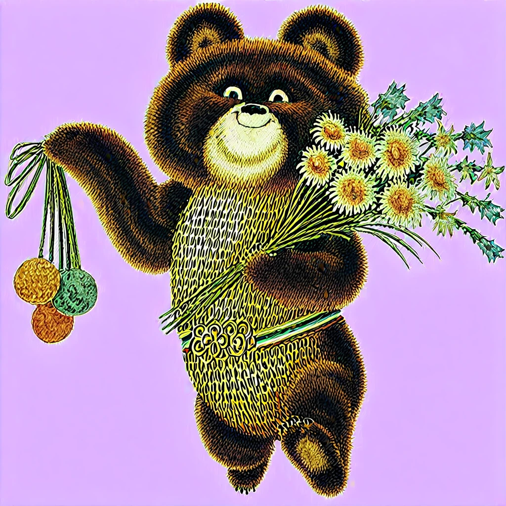The mascot of the 1980 Olympic Games in the USSR, the art style is retro, imitating postcards from the Soviet era of the 1980s: soft edges, even colors, a minimum of shadows and the feeling of drawing by hand. No additional elements or accessories — focus on the iconic image of the bear. I hope this little bear will bring you good luck, as he has brought it to me more than once.