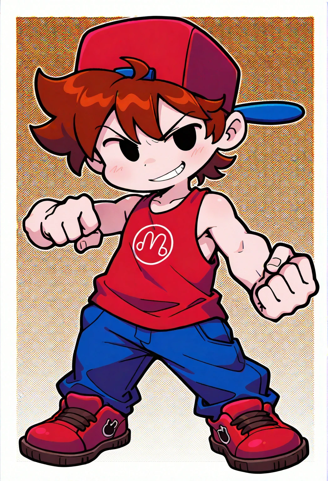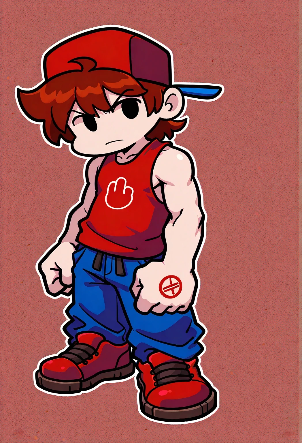 ChrisFNF, 1boy, black eyes, no sclera, light skin, short auburn hair, backwards red cap with a blue brim, red sleeveless top with a white hand symbol, blue pants, red shoes, brown laces, brown soles, short, chibi