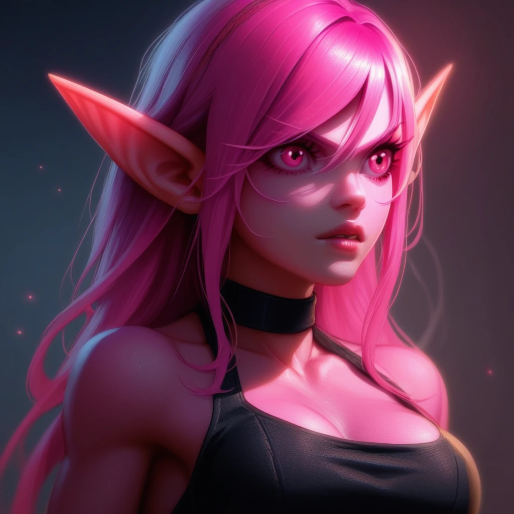 Niximb2, long hair, pink hair, pointy ears, pink eyes, breasts,