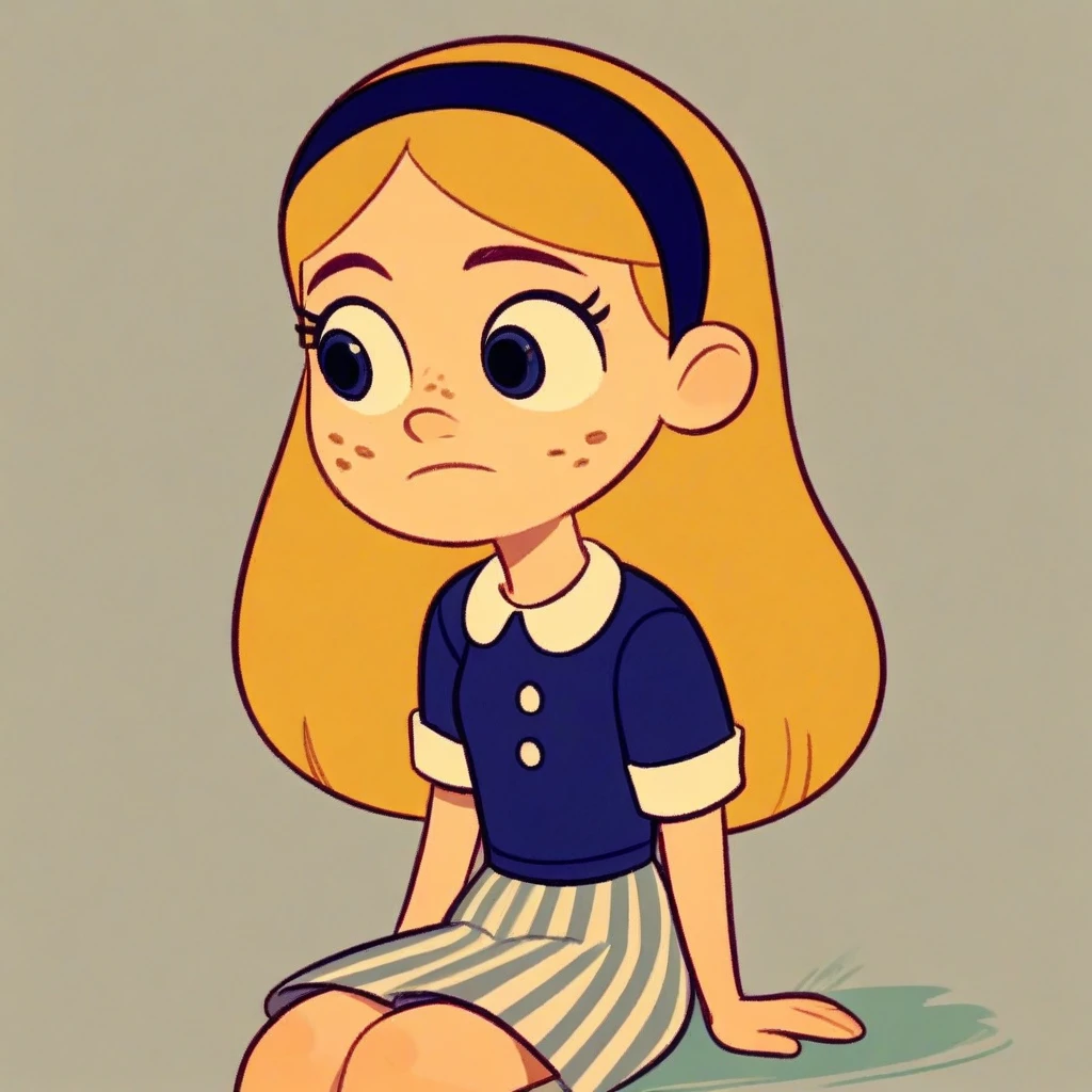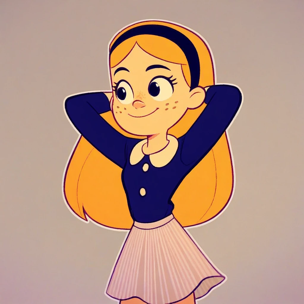 faye, blond hair, long hair, hairband, freckles, skirt,