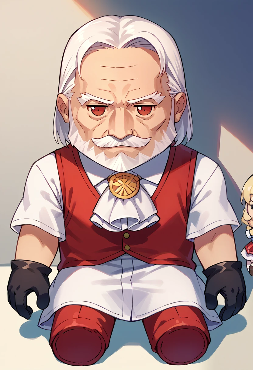 RegalBuisnessman, old man, mustache, beard, medium hair, straight hair, ascot, white shirt, short sleeves, red vest, red pants, side cape, white cape, black gloves